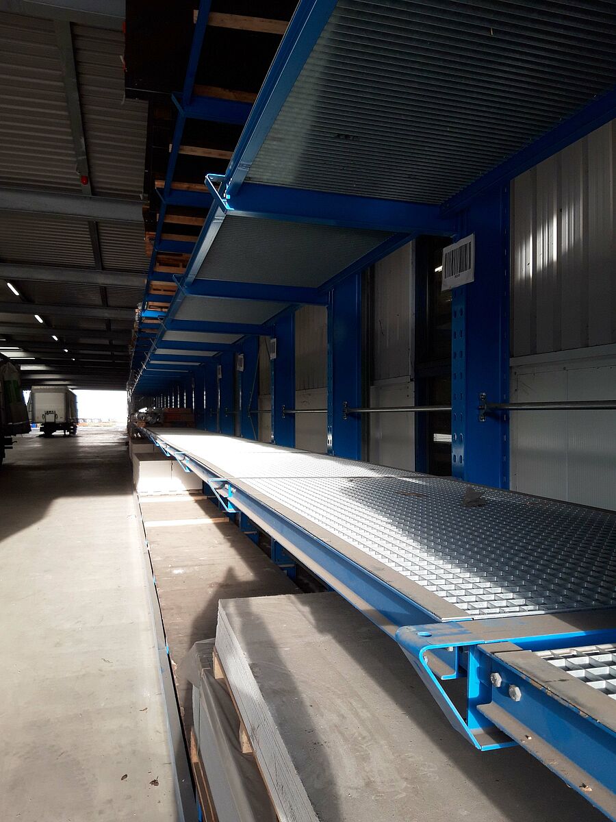 4PLUS supo apreciar no solo la calidad y la capacidad de carga de las estanterías de acero laminado en caliente, sino también la versatilidad de OHRA. Así pues, el líder del mercado europeo de estanterías cantiléver también integró en el nuevo sistema 80 cantiléver «antiguos» que todavía están disponibles en 4PLUS. Además, se equiparon a las estanterías adicionalmente con un total de 31 rejillas galvanizadas: Esto significa que el material almacenado en palés también puede ser almacenado de manera versátil en las estanterías cantiléver. El sistema de estanterías funciona con una carretilla elevadora de carga lateral, un sistema de guía para carretillas elevadoras en las bases facilita las maniobras en el pasillo entre las estanterías.