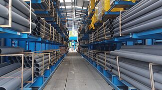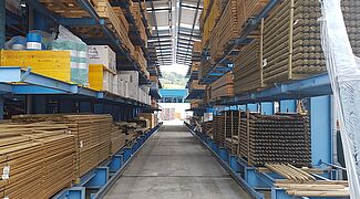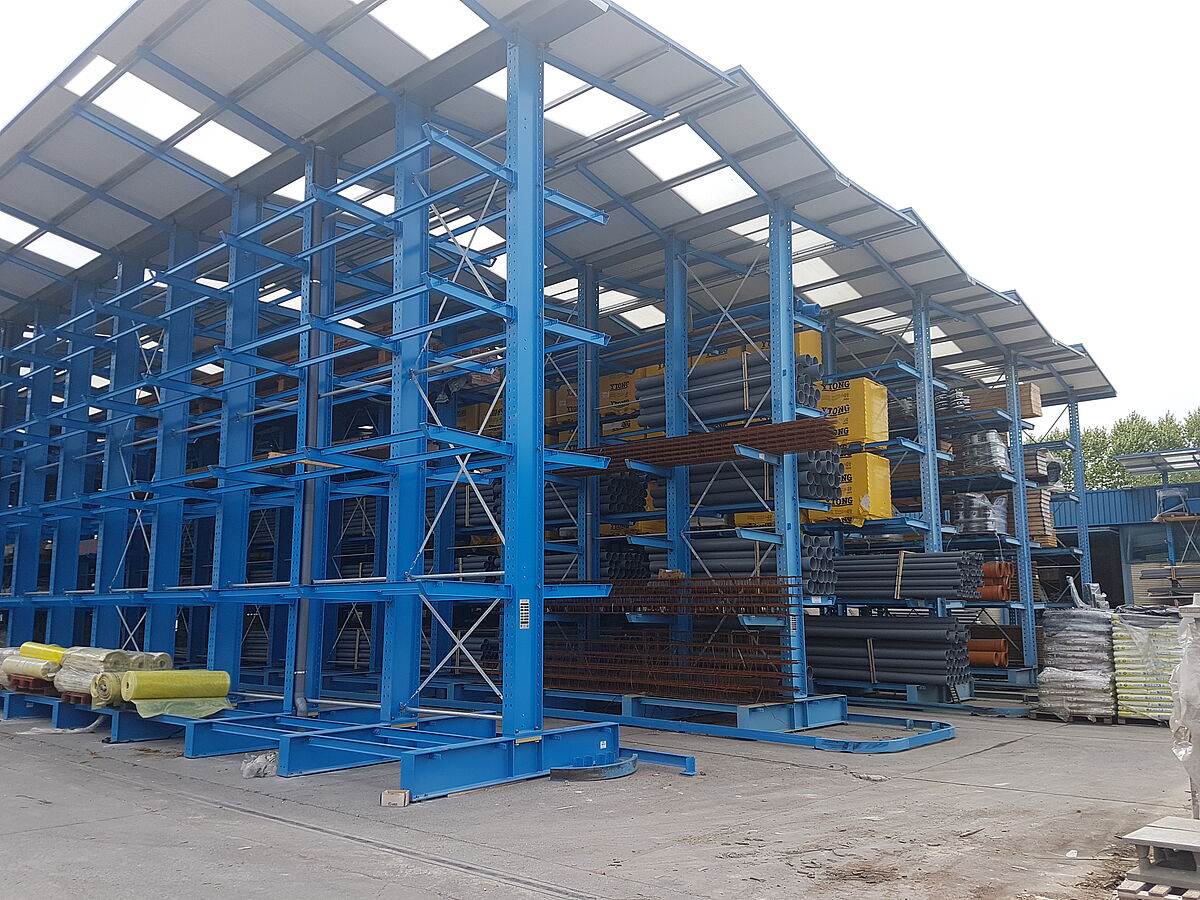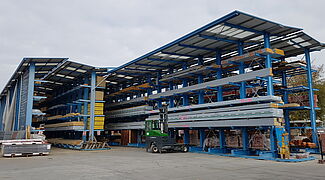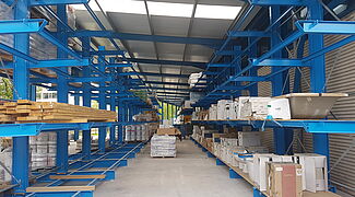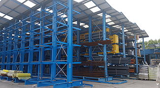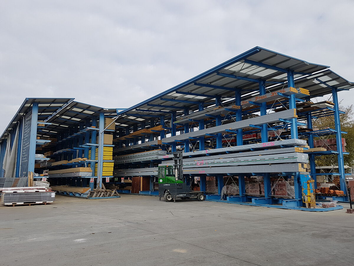 En el exterior, una estantería Cantiléver con brazos de techo y compuesta de brazos de carga abatibles OHRA, ha sido ampliada a lo largo de 2017, sirve como almacén para diferentes materiales como madera, hierro y materiales de construcción pesados. Los robustos brazos de carga abatibles sirven para soportar el peso de la mercancía, con una capacidad de carga de 1850 kg por brazo y repartida sobre cinco alturas. En algunas zonas de esta instalación exterior, se han añadido puentes entre los brazos para dar cabida a material paletizado de grandes dimensiones. Para soportar el peso del tejado de instalaron brazos de techo especiales diseñados para dicha función. Las guías de conducción de las estanterías permiten la entrada mecanizada de mercancía, en estantes de hasta 62 metros de longitud a cinco alturas, con la ayuda de una carrerilla de carga lateral.