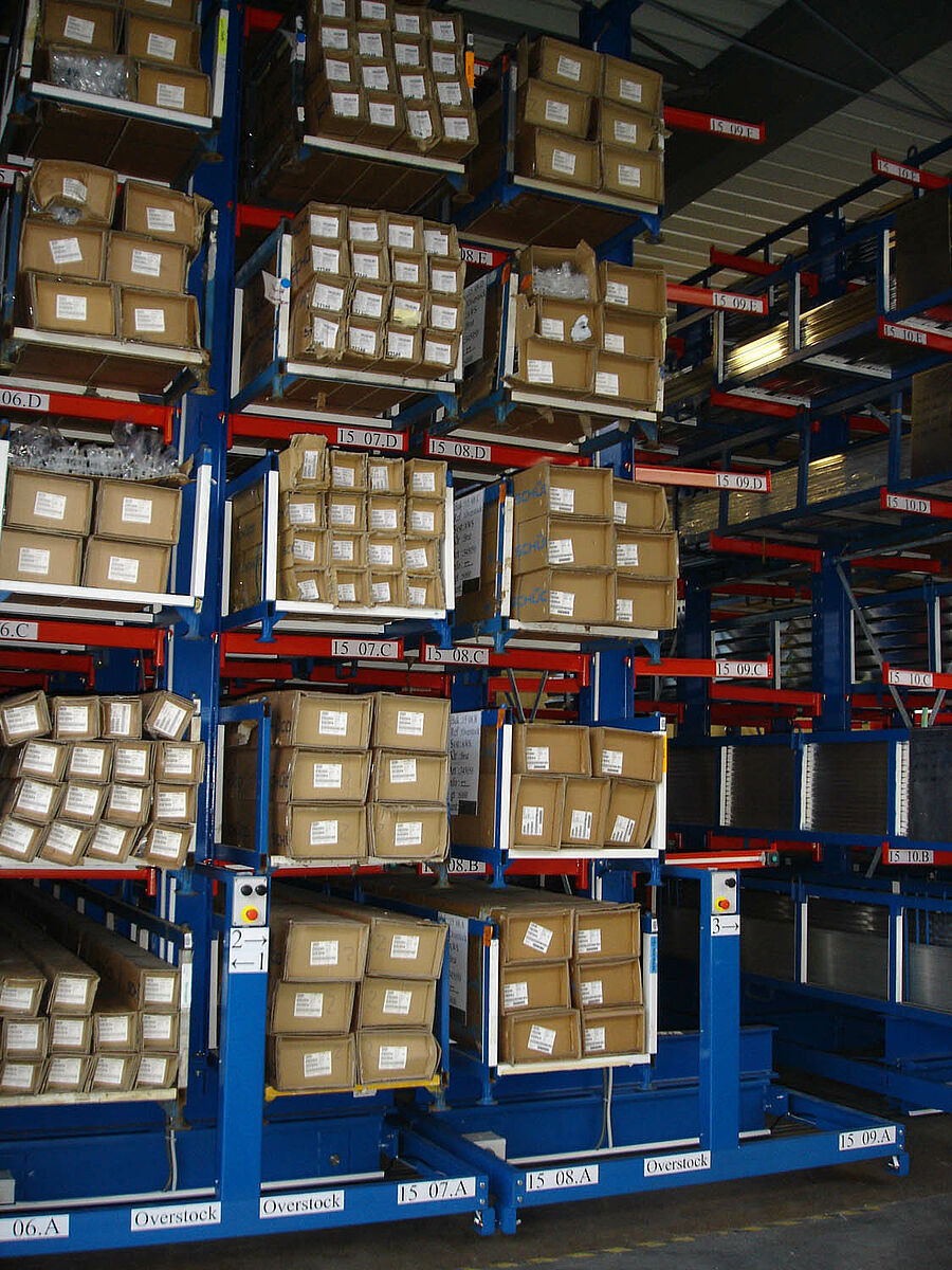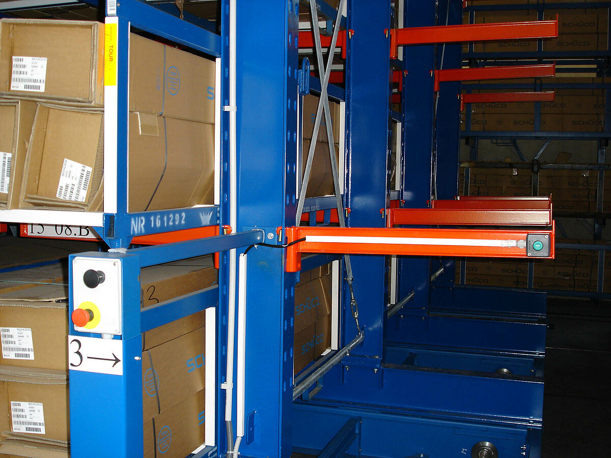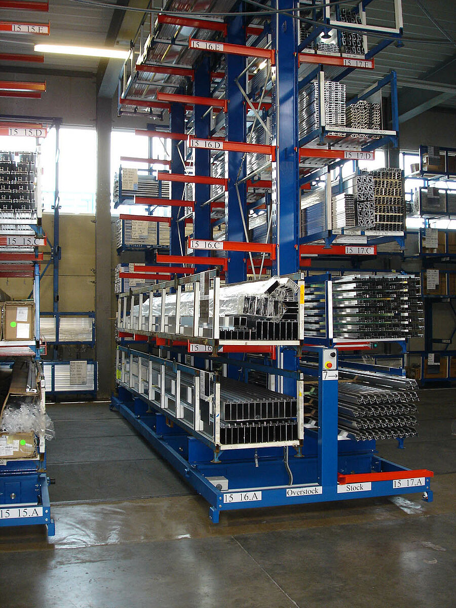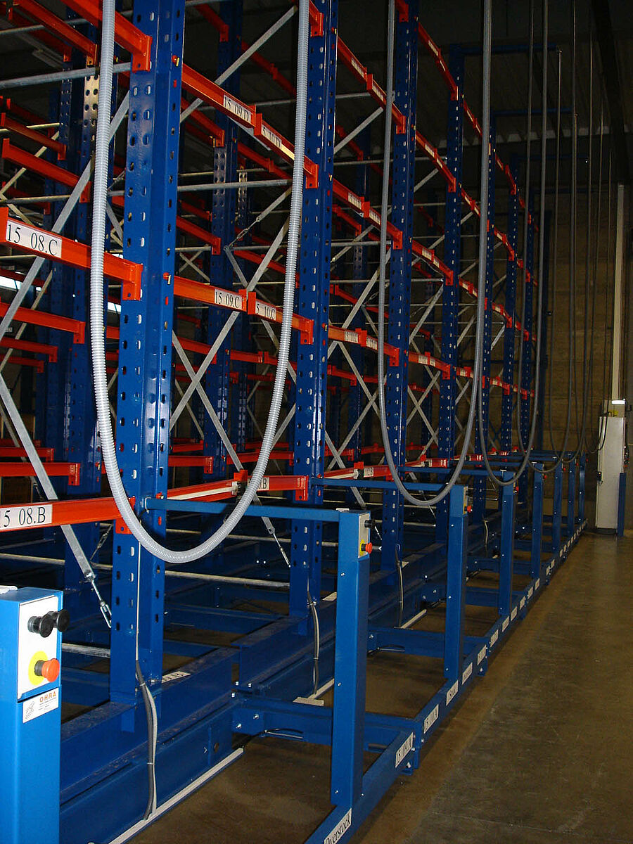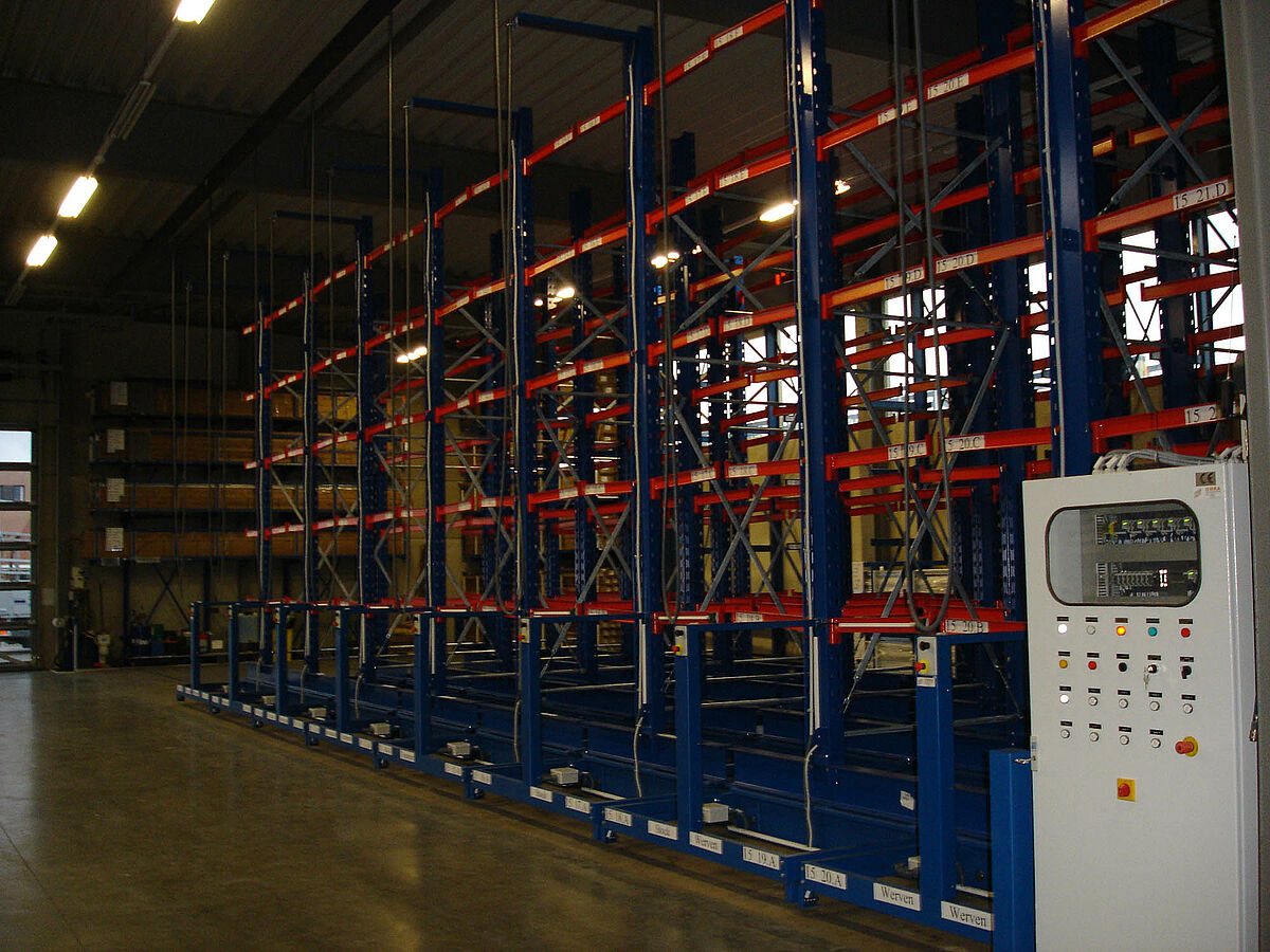 En las conversaciones con el cliente fueron elaborados diferentes posibilidades para al almacenamiento racional de los productos. La solución óptima fueron las estanterías cantilever sobre carros desplazables con precisión. Con este sistema de almacenamiento es posible, crear un gran volumen de almacenamiento sobre una superficie muy pequeña. Cada pasillo entre cada línea del estante fue planificado de manera que, en los estantes de pared existentes en los laterales de la instalación, se puede operar frontalmente. Esto no hubiese sido posible con estantes estáticos.