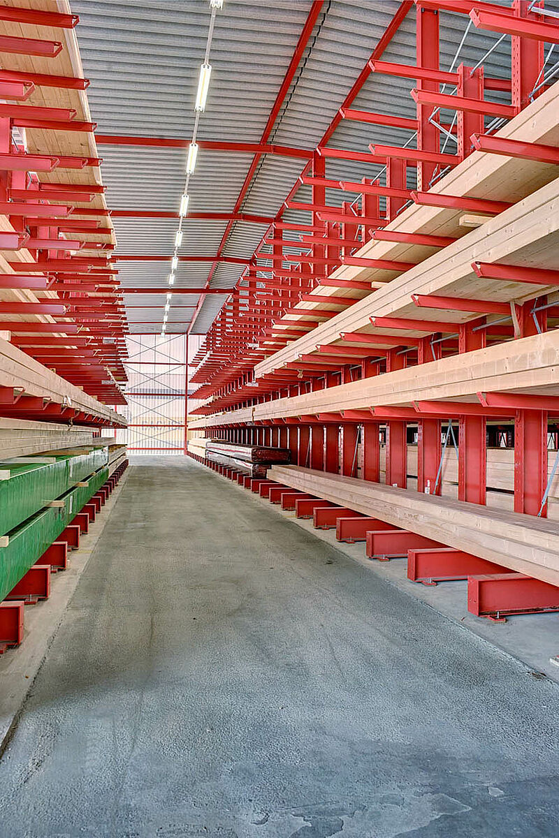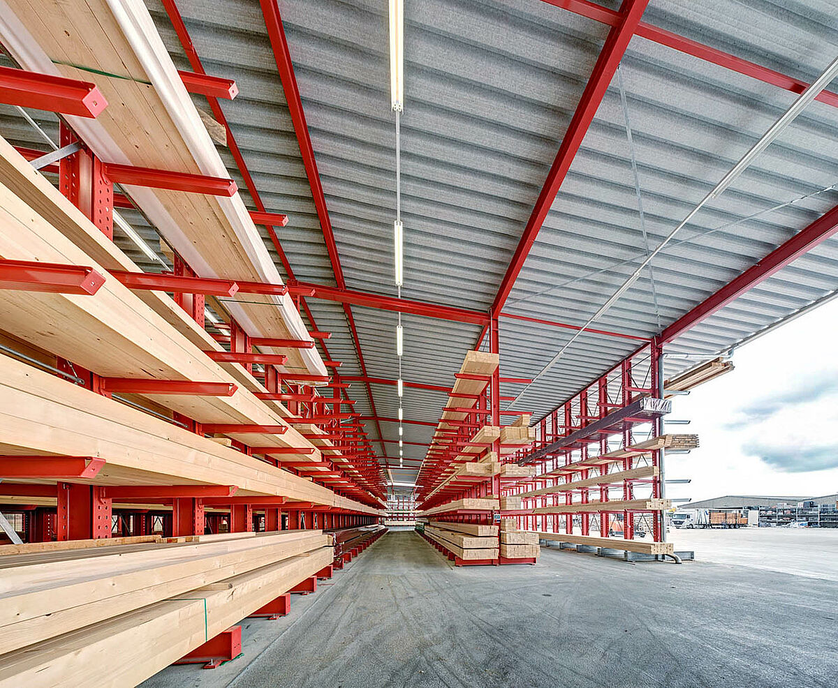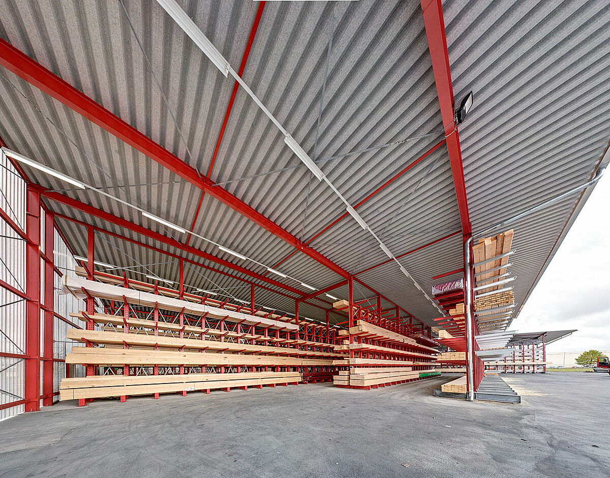 Ya en la fase de planificación, se reconoció que el almacén abierto con estantería voladiza era la solución más eficiente para esta construcción. Por eso se fabricaron, entregaron e instalaron más de 205 toneladas de acero por la empresa OHRA para los sistemas de estantería y la construcción del techo y pared.