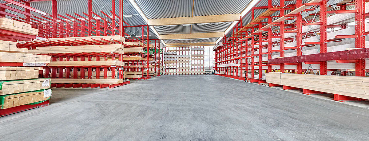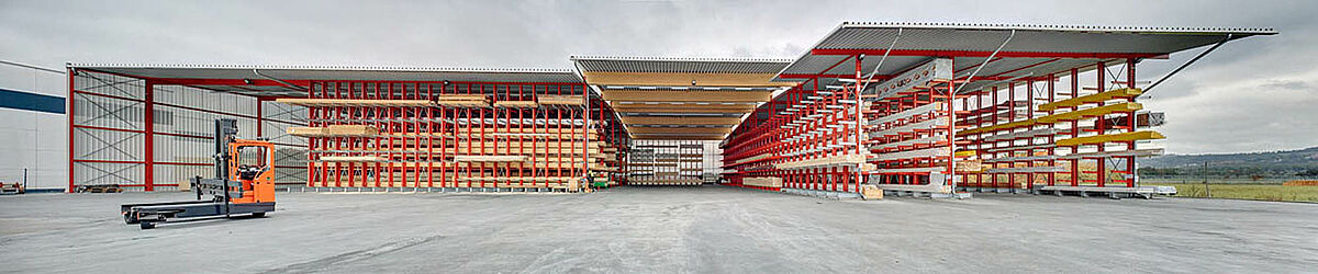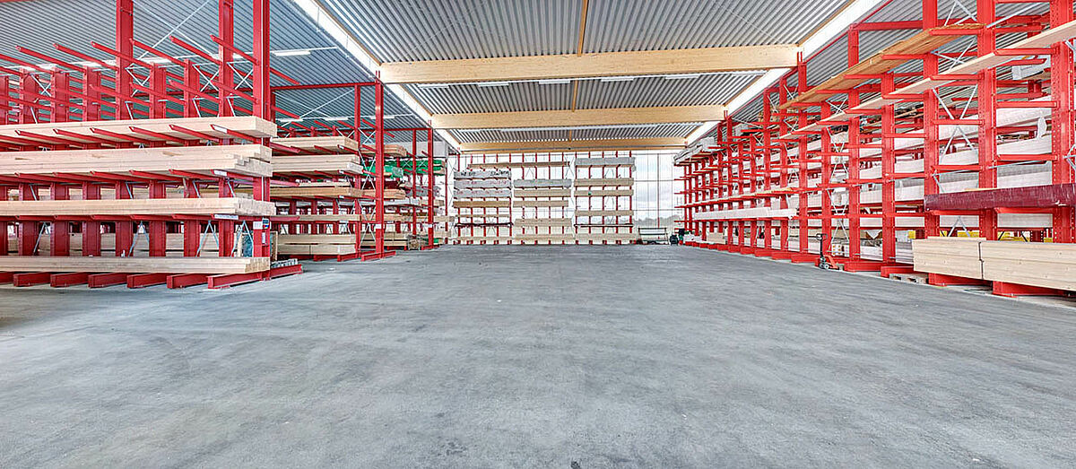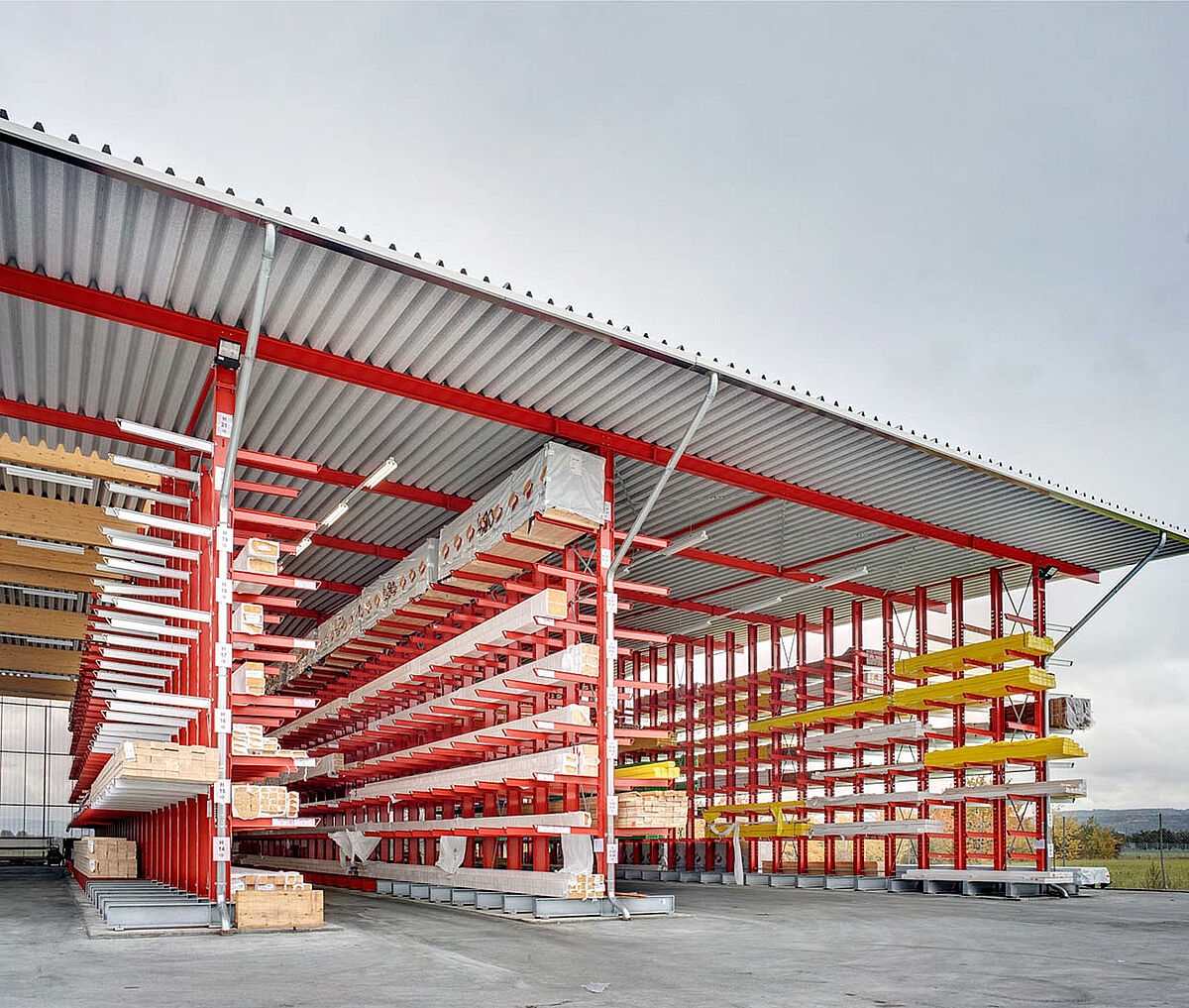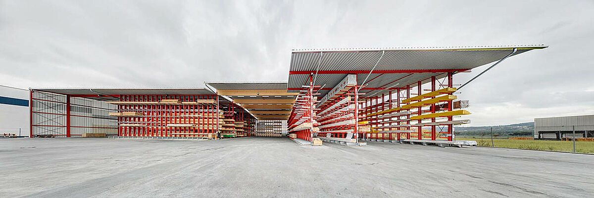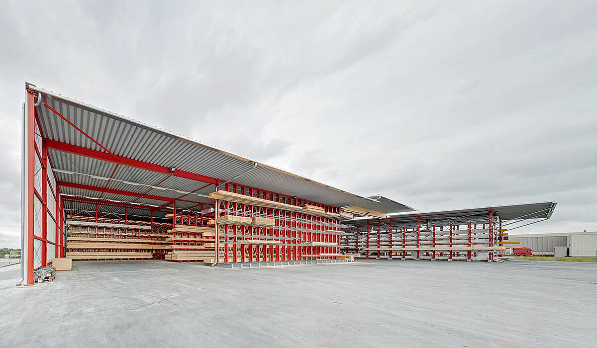 Ya en la fase de planificación, se reconoció que el almacén abierto con estantería voladiza era la solución más eficiente para esta construcción. Por eso se fabricaron, entregaron e instalaron más de 205 toneladas de acero por la empresa OHRA para los sistemas de estantería y la construcción del techo y pared.