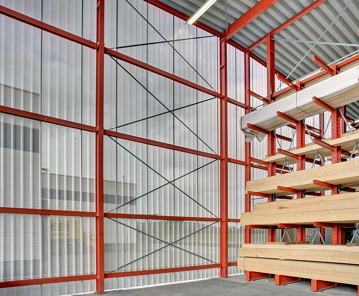 La construcción se realizó en acero de su color corporativo RAL 3000 por deseo del cliente. Una parte de los pies de la estantería voladiza se suministró en aplicación galvanizada, para que no se oxide por la lluvia. Finalmente se realizó la aplicación de las paredes laterales y traseras de la estantería con una plancha trapecio perforada. Gracias a la distribución especial de los huecos, la plancha es por una parte resistente a la lluvia y viento y por otra parte es transparente y transpirante.