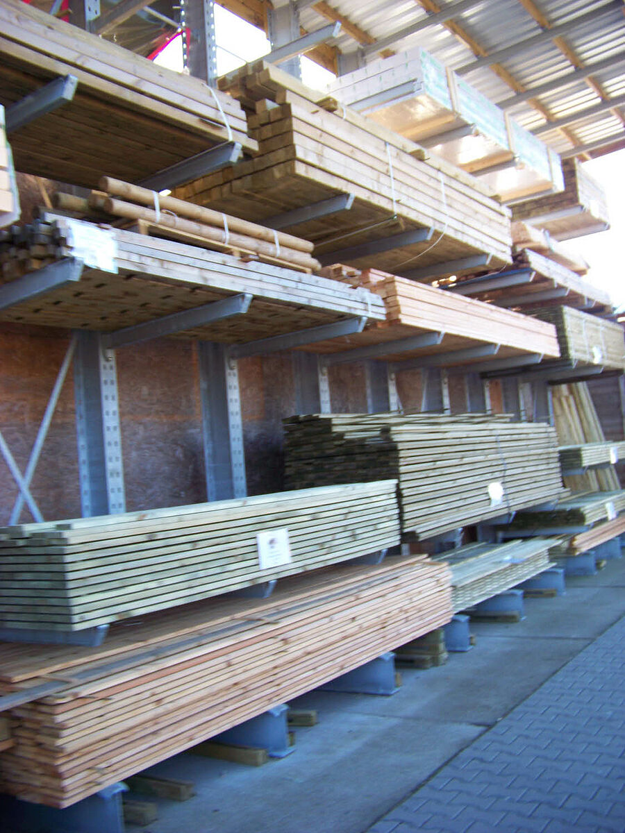 La madera se almacena en una zona exterior: la madera laminada y la madera para la construcción en paquetes de hasta 10 metros de longitud y el resto de los artículos en pilas más pequeñas de diferentes tamaños. Para ello, Dombal utiliza estanterías cantiléver de OHRA, el especialista en sistemas de estanterías con sede en Kerpen (Alemania). En concreto, la estabilidad de las columnas de las estanterías, fabricadas en perfiles de acero laminado en caliente, fue lo que convenció a los responsables de Dombal: Las columnas de alma maciza responden de forma elástica cuando se golpean y, en comparación con los modelos de chapa, conservan permanentemente sus propiedades estáticas aunque las condiciones de trabajo en el almacén sean extremas. Así, el sistema de estanterías cumple las máximas exigencias de seguridad.