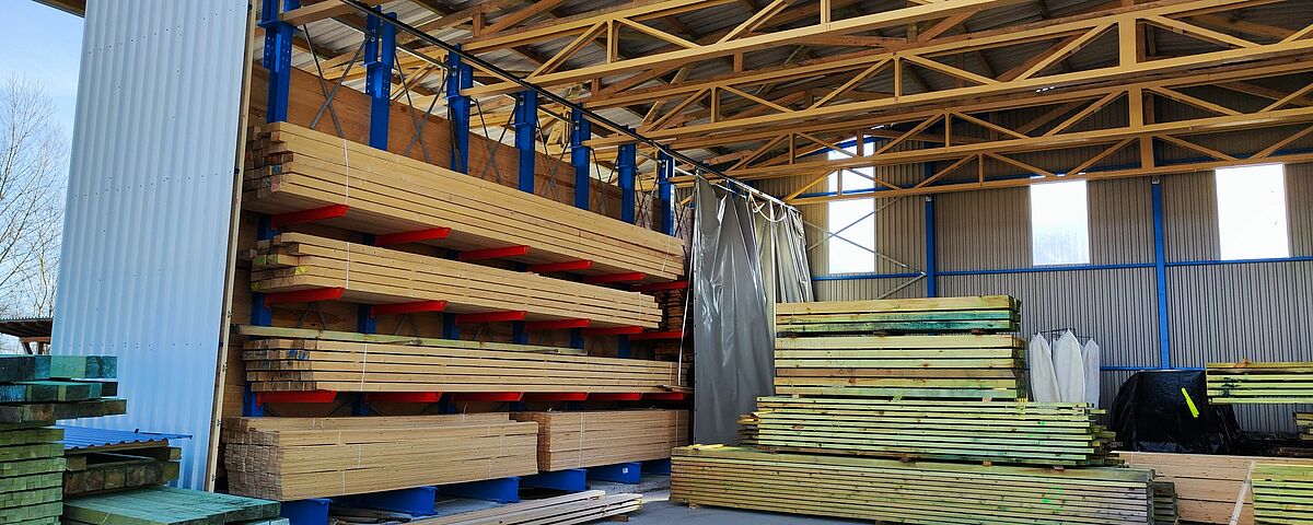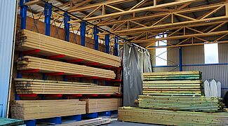 En Farkas-Fa, las paredes están compuestas por dos lineales de estanterías cantiléver de 12,4 metros de longitud cada uno. Debido a que las columnas de las estanterías OHRA están fabricados con perfiles de acero laminado en caliente, ofrecen una alta capacidad de carga y permiten grandes tramos en la estructura del techo: En Farkas-Fa, la distancia entre las dos filas de estanterías es de 15 metros. Esto permite añadir más adelante fácilmente una tercera fila de estanterías en el centro de la nave. Sarok-Fa prefirió una nave de estanterías abierta por los lados, facilitando así la circulación de aire para un secado óptimo de la madera almacenada. La estructura portante está formada por tres filas de estanterías cantiléver de doble cara. Un aspecto clave para Sarok-Fa fue la capacidad de ajustar los brazos cantiléver de las estanterías OHRA cada 100 milímetros de forma sencilla y sin herramientas. De este modo, las estanterías pueden adaptarse en cualquier momento a un surtido de productos variable.