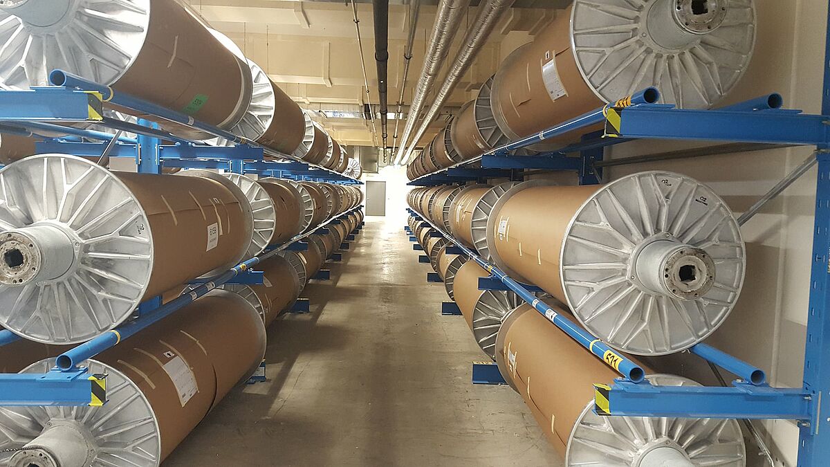 En total, OHRA ha entregado y montado hasta ahora tres estanterías cantiléver, en las que se pueden almacenar los plegadores de urdimbre en tres niveles. Los soportes de las estanterías, de entre 2,3 y 2,9 metros de altura, se adaptaron a la altura de la habitación en el sótano, para utilizar el espacio de forma eficiente. La ampliación del almacén con más estanterías cantiléver OHRA ya está se está planificando.