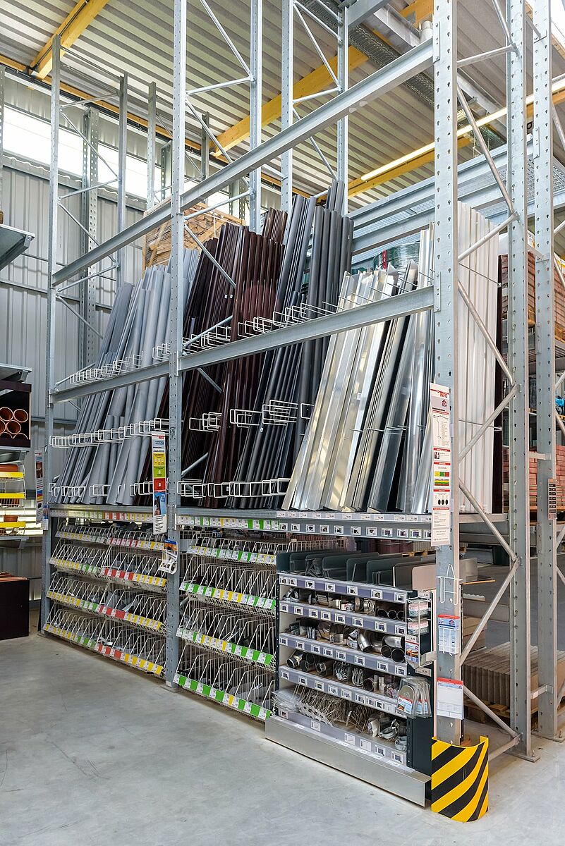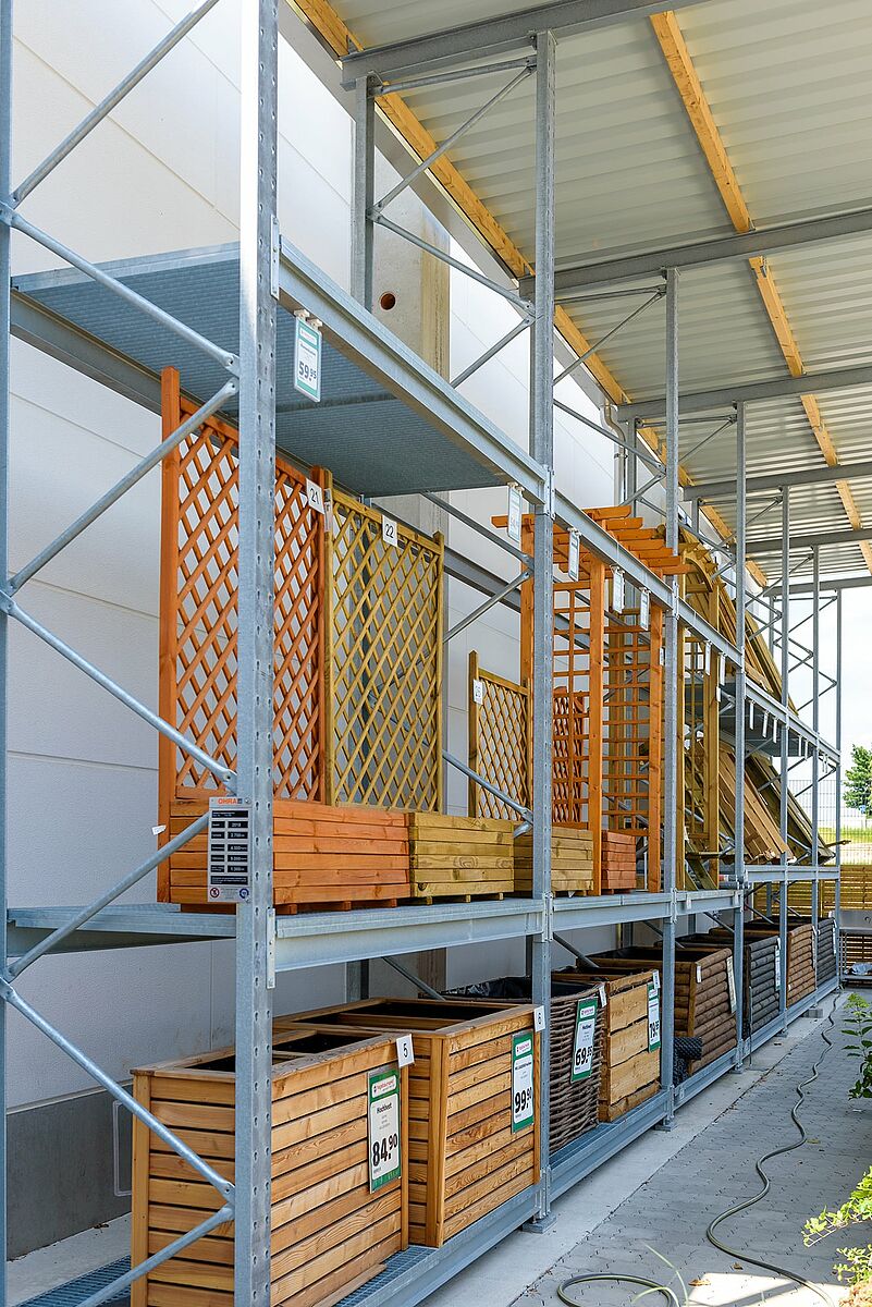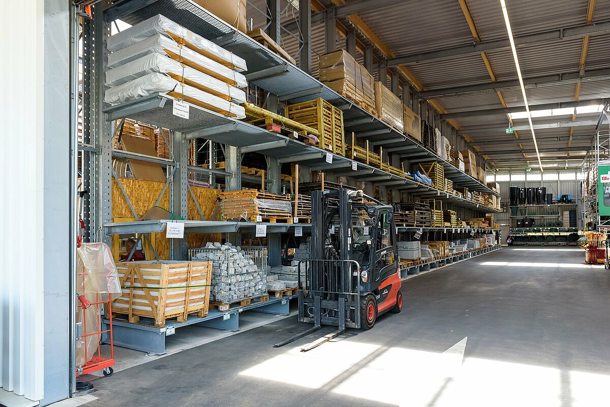 Para el almacenamiento de artículos de jardinería y madera Jos. Schneider optó por una combinación de estanterías cantilever y paletización de hasta 48 metros de longitud. Para llevar a cabo un almacenamiento versátil de los diferentes artículos en las estanterías cantiléver, se equipó con rejilla todos los niveles de almacenamiento. Las estanterías OHRA, gracias a la utilización de perfiles de acero macizo para todos los elementos portantes, logran una gran capacidad de carga y, además, pueden ceder elásticamente en caso de impacto y conservar sus propiedades estáticas de forma permanente. De este modo se ofrece también una base consistente para techo y paredes.