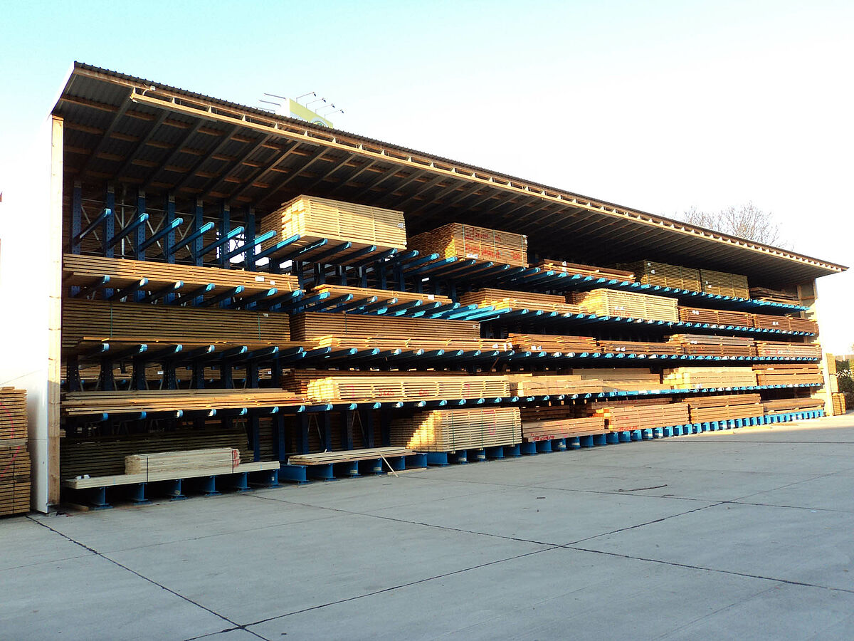 Para ello el sistema de OHRA permitió también cumplir los requisitos especiales al organizar los sistemas de estanterías, así por ejemplo, se pueden almacenar maderas de hasta 14 metros de largo en estanterías cantiléver, que con un brazo de 2350 milímetros de largo ofrecen una superficie de almacenamiento dos veces mayor que lo normal. Además, las hileras cantiléver de hasta 6 metros de altura y 50 metros de largo permiten un gran aprovechamiento de la superficie de almacenamiento. Para el área de almacén exterior las estanterías cantiléver además están equipadas con un techo y a pedido de Possling el brazo techado de 4 metros se ejecutó especialmente largo. OHRA equipó las estanterías para palés con diversos compartimentos para así poder almacenar también mercancía en sacos, piedras, etc. de forma segura y economizando espacio.