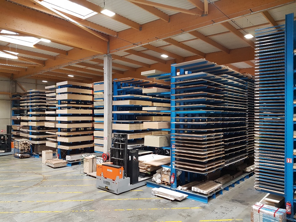 En 2017, Hue-Socoda se trasladó a una nueva ubicación, adyacente a la antigua sucursal, aunque con menos espacio disponible, fue posible ampliar significativamente la capacidad de almacenamiento y, así, mejorar los procesos logísticos. Las estanterías cantiléver OHRA, que gracias a su construcción de perfiles de acero laminados en caliente de paredes sólidas permiten una gran capacidad de carga, contribuyen significativamente a lo siguiente: De esta forma, se pudo aumentar la altura de almacenamiento hasta nueve metros (en la antigua sucursal, el sistema de estanterías tenía solo cuatro metros de altura). Esto proporciona la capacidad de almacenamiento suficiente para acceder a los 1.200 artículos, incluyendo paneles o puertas de madera, melamina y laminados. Así, todo el inventario se pudo realizar en un solo edificio. Otro punto importante a favor de las estanterías voladas OHRA es que los brazos de la estantería no están atornillados, sino simplemente enganchados a las columnas. Esto significa que la altura de los niveles de almacenamiento individuales puede cambiarse sin herramientas si, por ejemplo, los cambios en la cartera de productos así lo requieren.