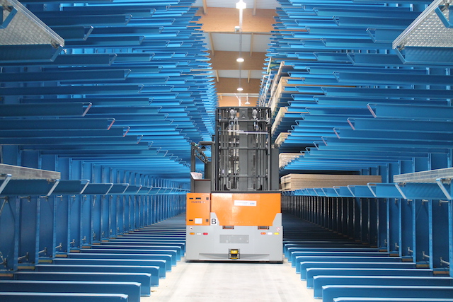 Hue-Socoda es uno de los principales distribuidores de tableros de madera en Bretaña, y ha equipado su nueva sucursal en Langueux con los sistemas de estanterías OHRA: Gracias a la estabilidad de las estanterías cantiléver, se pudo montar un sistema de estanterías de hasta nueve metros de altura y, por lo tanto, es el doble de alto que en la antigua sucursal. Además, la plataforma de almacenamiento optimiza aún más la utilización del espacio en el almacén: Gracias ella, el material pequeño puede almacenarse en dos estantes. Además, las consolas de 90 centímetros de altura simplifican la recepción de paquetes de placas durante la entrada de mercancías mediante carretillas elevadoras.