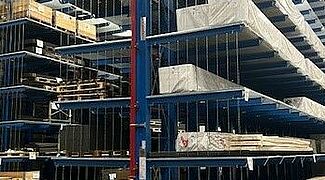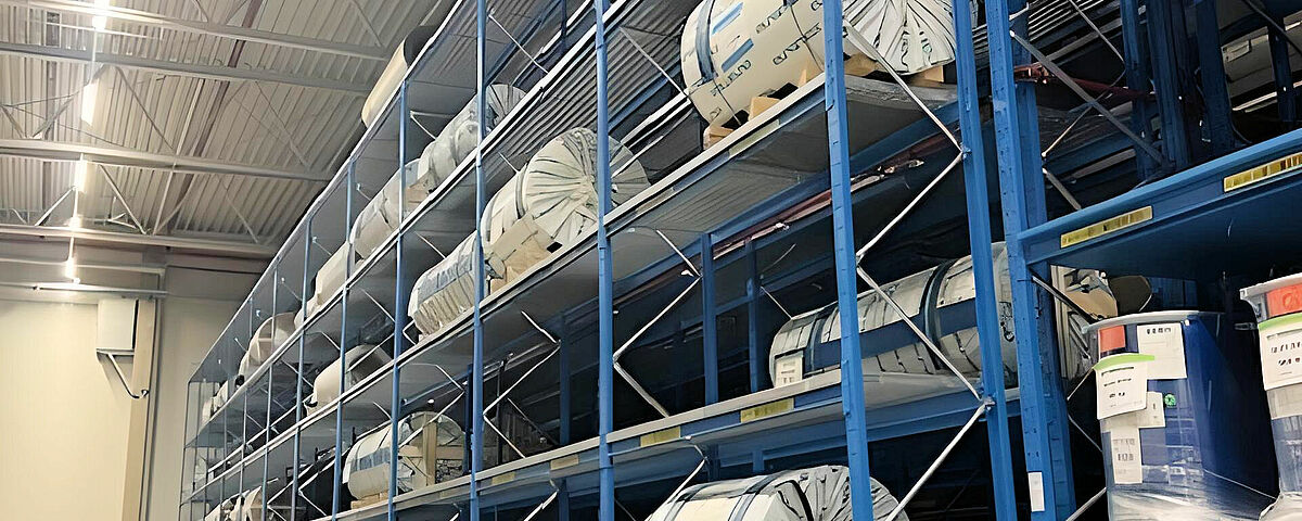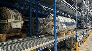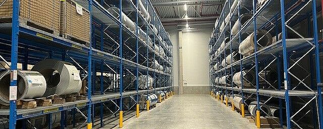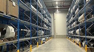 La combinación de estanterías cantiléver y de palés permite almacenar materiales tan diversos como adhesivos, bobinas de aluminio y plástico reforzado con fibra de vidrio, paquetes de madera contrachapada, suelos de PVC o listones de madera y espuma de poliuretano. Una de las ventajas de las estanterías OHRA, fabricadas con perfiles de acero laminado en caliente, es su gran capacidad de carga: En Knaus Tabbert, por ejemplo, las estanterías cantiléver pueden soportar hasta 12 toneladas por montante, y la capacidad de carga de un solo cantiléver es de hasta 1.000 kilogramos, incluso en el nivel de almacenamiento más alto, a 7,5 metros de altura. Las bobinas de plástico reforzado con fibra de vidrio, con un peso de hasta 1,2 toneladas, y las bobinas de chapa, con un peso de hasta 1,8 toneladas, se almacenan en estanterías de palés. Las baldas de rejilla permiten un almacenamiento flexible independientemente del formato de los dispositivos auxiliares de carga de bobinas. También en las estanterías cantiléver, las baldas de rejilla permiten a veces almacenar una gran variedad de contenedores y portacargas.