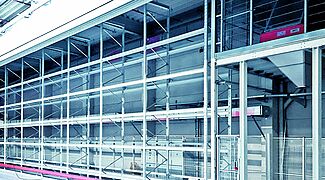 Para esta zona de almacenamiento, OHRA suministró e instaló una estantería de palés de 27,3 metros de longitud, que ofrece espacio de almacenamiento para aproximadamente 100 de los contenedores de almacenamiento con un peso de hasta 600 kilogramos. Directamente conectada al bastidor se encuentra una plataforma de construcción de acero también suministrada por OHRA. En ella se instala el dispositivo de volcado, que se utiliza para llenar las semillas transportadas por cintas transportadoras o elevadores de cangilones en los contenedores de almacenamiento situados debajo. A continuación, los contenedores son recogidos y almacenados por un transelevador de Köttgen, que, al igual que OHRA, pertenece al Grupo Hölscher. Las consolas y el carril de guía de la máquina de almacenamiento y recuperación se guiaron a lo largo de todo el sistema. De este modo, la estantería y la plataforma forman una sola unidad. Así se garantiza el transporte sin fisuras de los contenedores desde el dispositivo de volcado hasta la ubicación de la estantería.