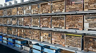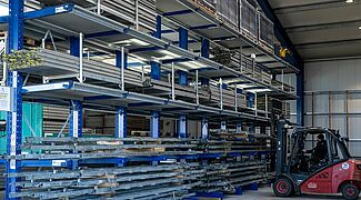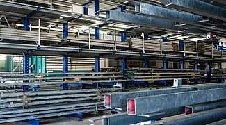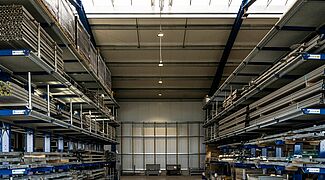 La heterogeneidad de los productos almacenados planteaba un reto: en las nuevas estanterías deben caber artículos de distintos pesos, longitudes y alturas, así como en distintos medios de almacenamiento (cajas, palés, estanterías con cuatro patas angulares). "En la práctica, para nosotros era importante almacenar toda la mercancía existente en el almacén en un solo sistema de almacenamiento", afirma Fabian Bechtold, Director general de LEUBE. Para hacerlo posible, todos los niveles de almacenamiento de la estantería cantiléver se equiparon con trámex (o rejilla). Esto permite almacenar los artículos de forma versátil y sin problemas pieza a pieza.