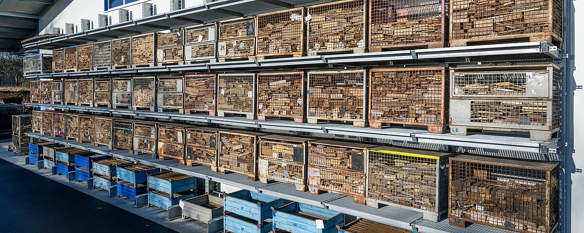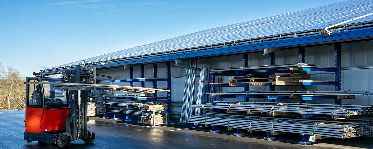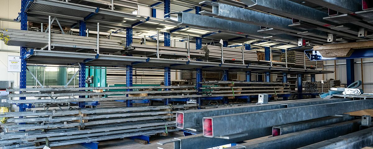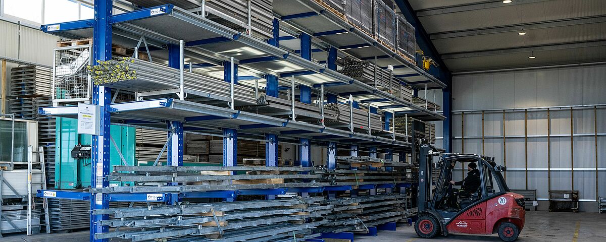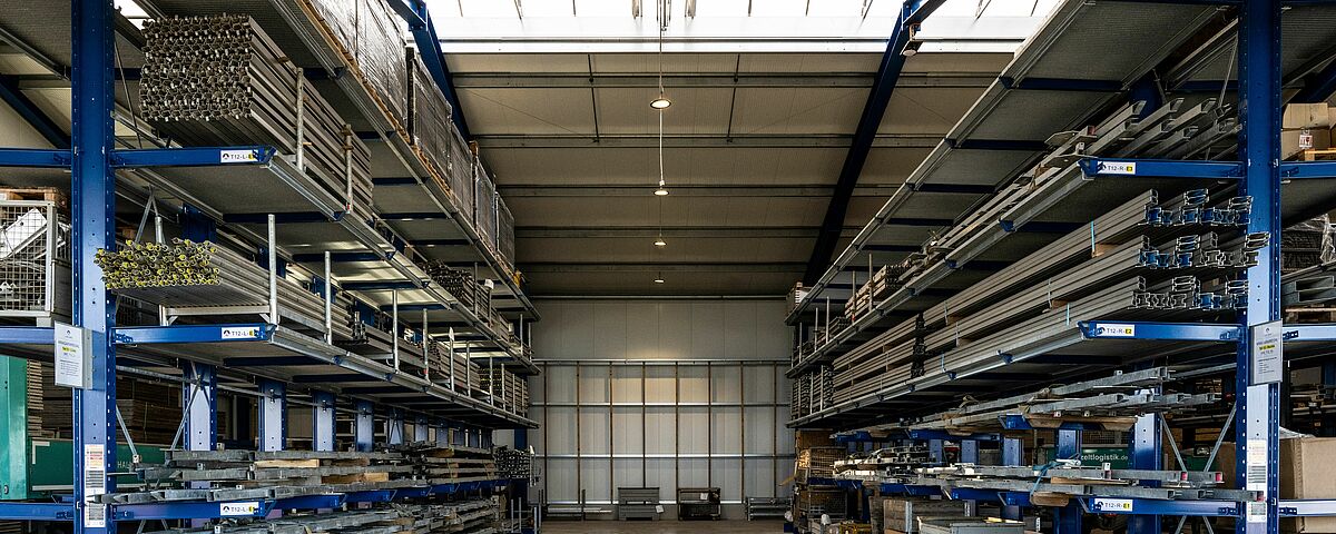 Las enormes exigencias de espacio y la consiguiente falta de superficie, con la consiguiente ineficacia en el trabajo, llevaron a tomar la decisión de sustituir el anterior sistema de almacenamiento en bloque por un sistema de almacenamiento en estanterías. En la nave de nueva construcción hay tres estanterías cantiléver de doble cara de 16 metros de largo cada una. Con una altura de 6,28 metros, las estanterías ofrecen cinco niveles de almacenamiento (incluida la base) y, por tanto, espacio suficiente para almacenar el material necesario para las tiendas y naves en ubicaciones específicas. Además, OHRA instaló una estantería cantiléver unilateral de 19,2 metros de longitud en el exterior de cada una de las paredes laterales de la nave, donde la mercancía almacenada queda protegida de la intemperie por el voladizo del techo. La capacidad de carga de los brazos cantiléver de todas las estanterías es de 1.100 kilogramos y la longitud de 1.200 milímetros.
