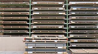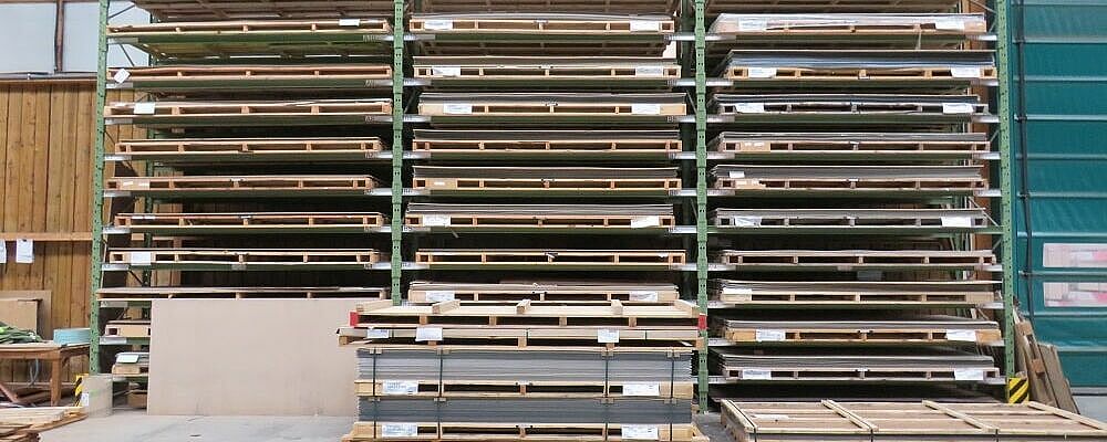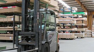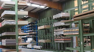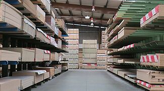 Dado que en la zona de paneles HPL había que acomodar un gran número de artículos diferentes, que se almacenan en palés especiales de 3050 x 1.300 milímetros, se utiliza aquí una estantería de palés: Con una longitud de unos diez metros y una altura de aproximadamente 6 metros, cuenta con 15 niveles de almacenamiento. Esto crea un gran número de compartimentos de almacenamiento, lo que permite el almacenamiento de artículos específicos por compartimento de estantería y, por tanto, un acceso rápido a las mercancías.