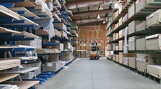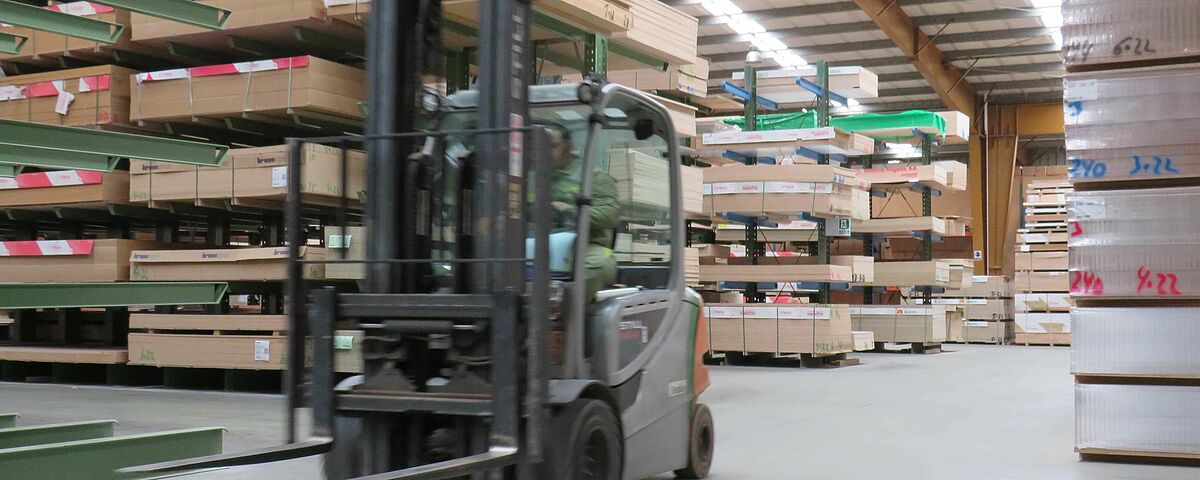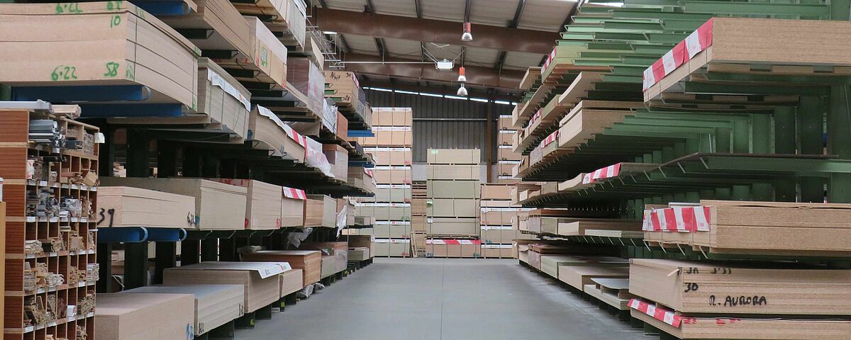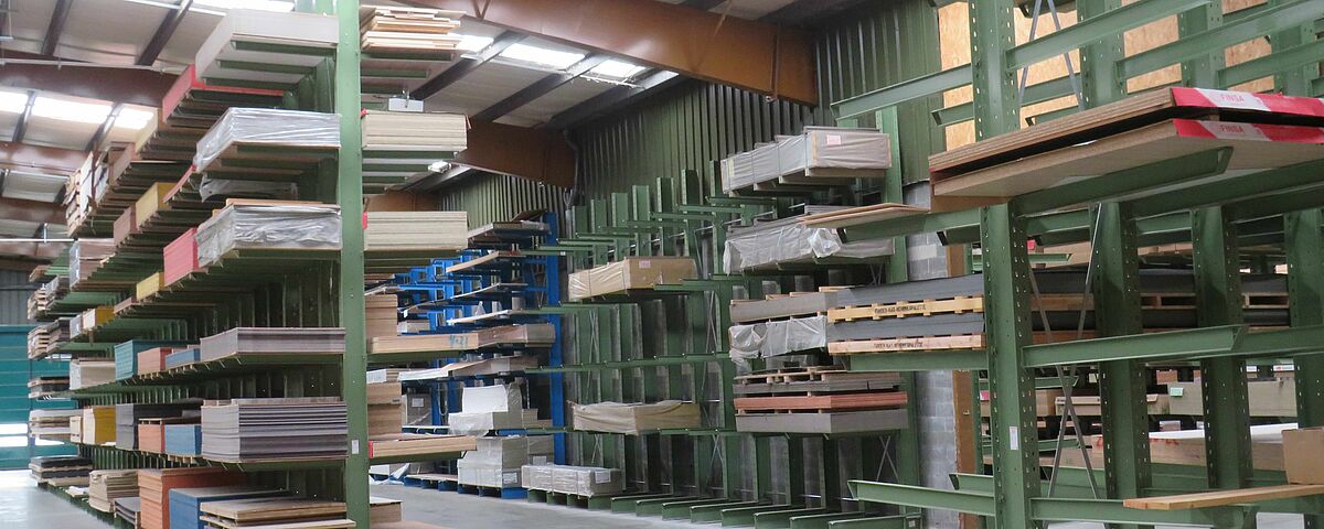 Por ello, OHRA instaló varios sistemas de estanterías en la zona de almacenamiento: Se trata de estanterías cantiléver, cuyos brazos de hasta 1.850 milímetros de longitud tienen una capacidad de carga de hasta 800 kilogramos cada uno; el nivel superior de almacenamiento es de 6,7 metros en su parte más alta. Aquí se almacenan principalmente tableros que tienen una alta rotación y que deben ser recuperados con la correspondiente rapidez.