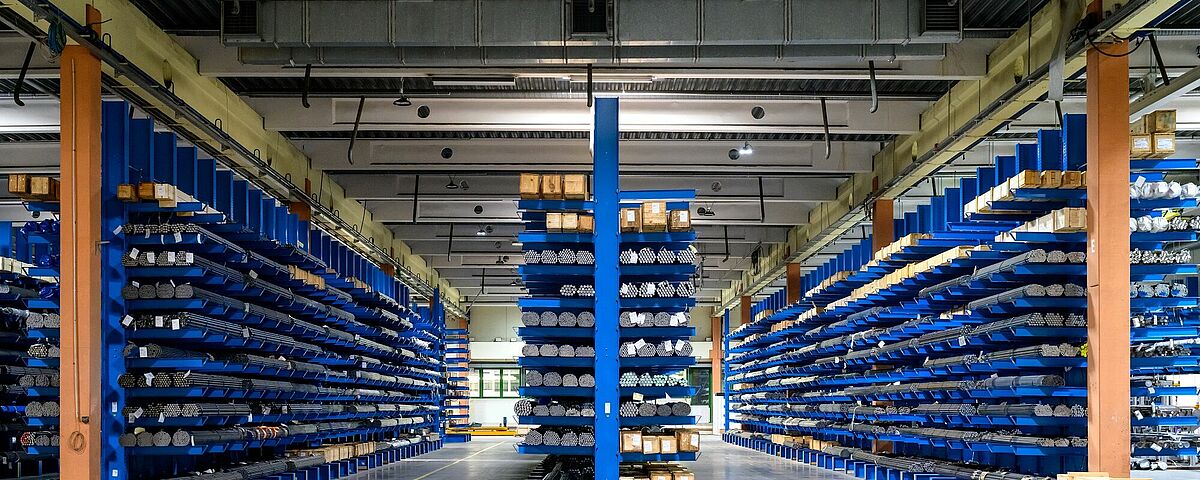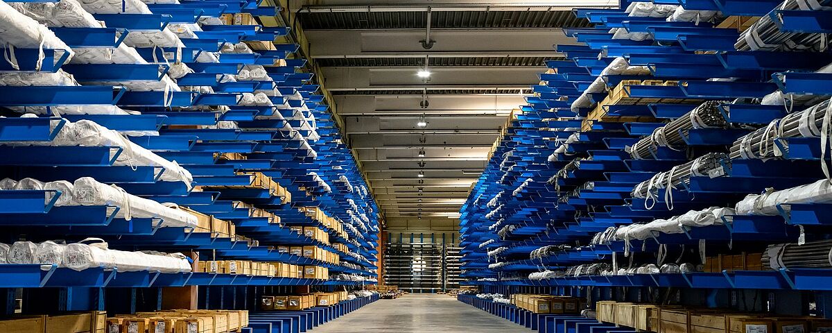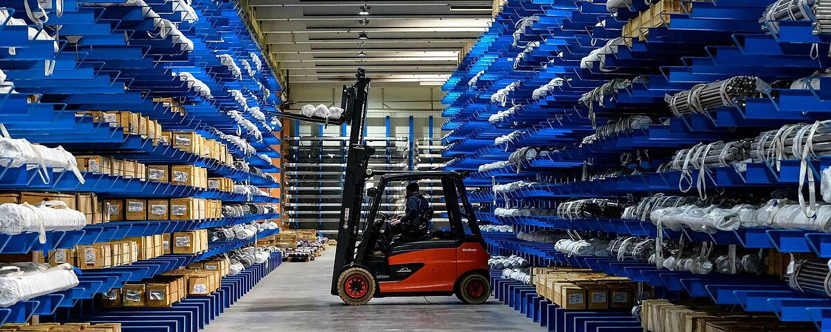 Por lo tanto, el uso de carretillas elevadoras constituyó la base del concepto del nuevo almacén de mercancías largas: Los aceros inoxidables deben almacenarse en formatos largos y longitudes de bobina de 3 a 6 metros en estanterías cantiléver. De este modo, la carretilla puede utilizarse para acceder a artículos individuales de forma rápida y selectiva. Deben utilizarse carretillas elevadoras para 5 toneladas, que pueden mover cómodamente una carga de 4 toneladas. Cada estantería debe poder llenarse con una carga de carretilla elevadora para que los procesos sean lo más sencillos posible. Wiedmann fijó en 5,5 metros la altura de elevación segura que debía alcanzarse.