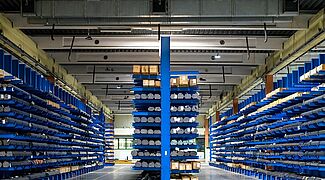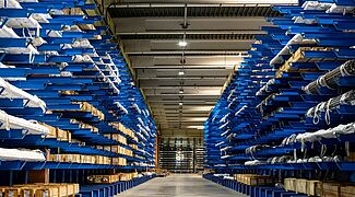 De este modo, se establecieron las condiciones básicas del sistema de estanterías cantiléver: Nivel superior de almacenamiento a 5,25 metros, diez niveles de almacenamiento, carga de estantería de 4 toneladas, carga total de 40 toneladas. «Sólo unos pocos fabricantes de estanterías tienen en su gama estanterías estándar para estas altas cargas», afirma Wiedmann. OHRA, por su parte, pudo ofrecer un proyecto perfecto para sus necesidades. Gracias al uso de perfiles de acero de alma maciza laminado en caliente, las estanterías cantiléver de la empresa de Kerpen tienen una enorme capacidad de carga. «El tramado de los estantes cantiléver, cada solo 5 centímetros, también era importante para nosotros», añade Wiedmann. «Esto nos permite ajustar las alturas de los compartimentos con gran precisión a la altura necesaria para los paquetes. Esto significa que almacenamos menos aire o que podemos minimizar las alturas de elevación necesarias: cada centímetro ahorrado reduce el tiempo de manipulación».