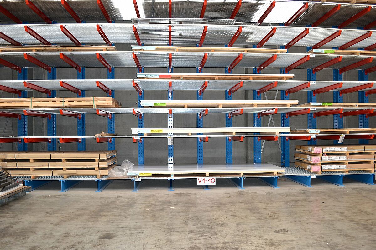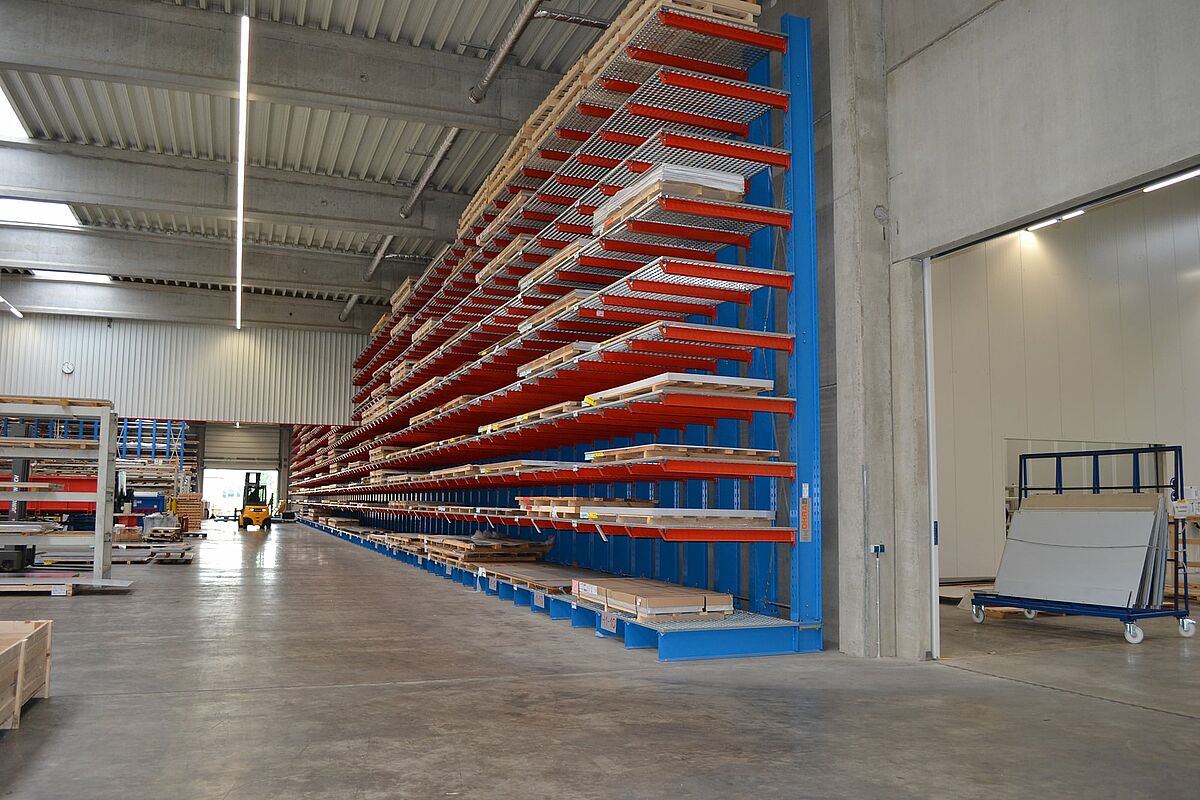 Para poder acceder rápidamente a las chapas de 1.000 x 2.000 a 2.000 x 6.000 mm en la nueva planta de producción, Ronge Profil decidió instalar estanterías cantiléver OHRA. Se diferencian de las estándar por el uso de perfiles de acero macizo para todos los elementos que soportan carga. Esta es la base para la alta capacidad de carga y el estrecho diseño de las estanterías, lo que da como resultado un almacenamiento compacto en un espacio reducido.