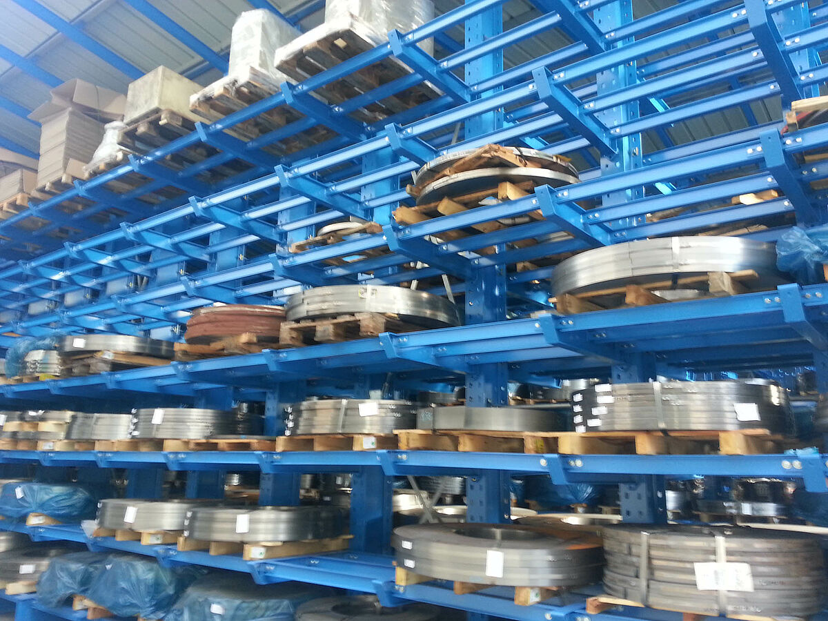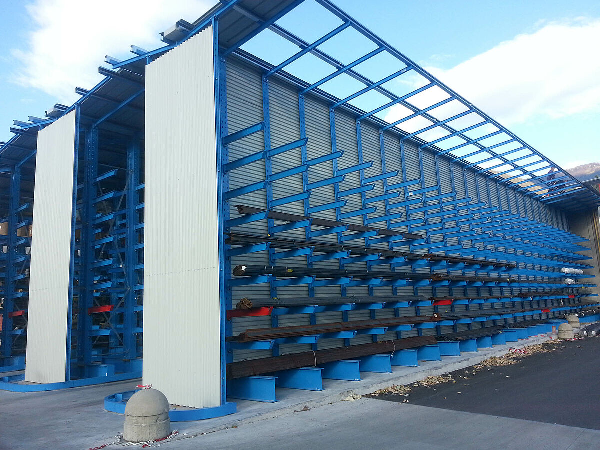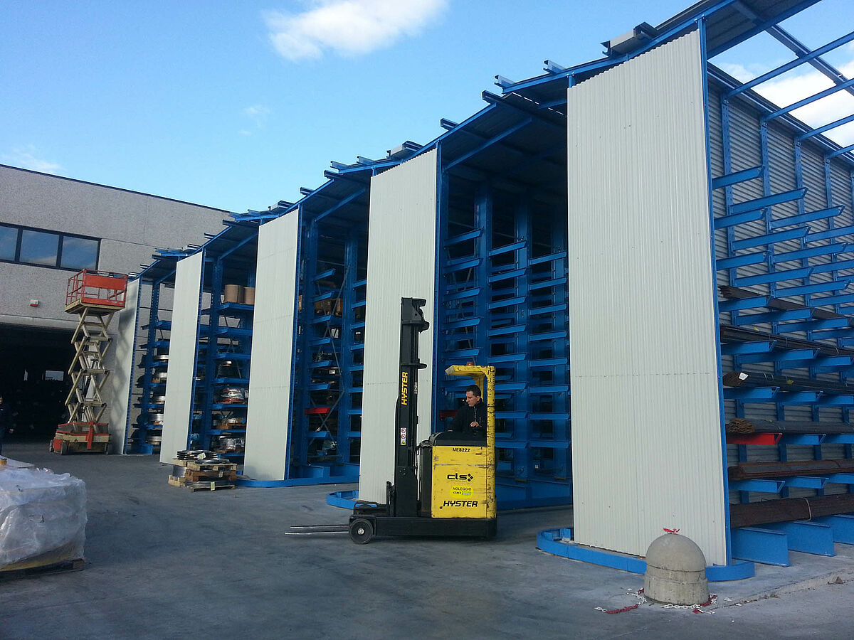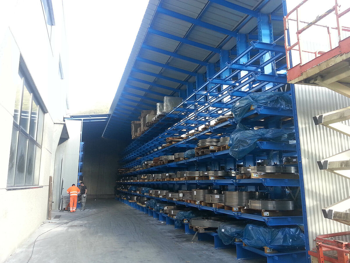 En las tres primeras filas de estanterías se almacena el material enfardelado en barras de 6.500 milímetros de largo y 4.000 kilogramos a doble profundidad en nueve niveles. Los brazos en voladizo están enganchados y se pueden ajustar milimétricamente mediante tornillos garantizando el almacenamiento simétrico de la mercancía. Estos pasillos se operan con una carretilla elevadora que se conduce por los carriles incorporados en las columnas. Las filas de estanterías restantes están equipadas con puentes entre brazos ofreciendo así una superficie de almacenamiento continua en siete niveles. Aquí se almacenan hasta 1.200 kilos de rollo de chapa en palés. Una carretilla elevadora opera en estos pasillos.