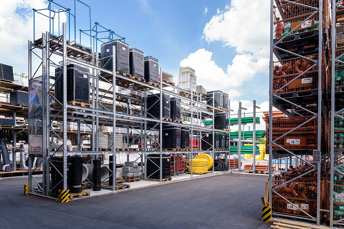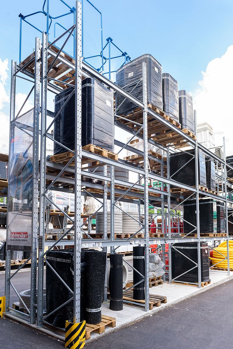 La compañía optó por una combinación de estanterías cantilever y estanterías de paletización: De esta forma el almacenamiento se adapta a las características más variadas de la amplia gama de productos. Las estanterías se ajustan exactamente a los requerimientos de la gama de productos. De esta forma es posible almacenar tres paletas con material aislante apiladas en cinco niveles de estanterías cantilever de 7.510 milímetros de alto. Gracias a la capacidad de carga de 4.500 kilogramos, los materiales pesados pueden almacenarse fácilmente sobre europaletas en las estanterías de paletización.