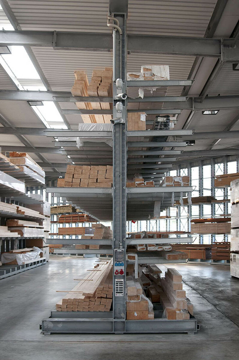 La empresa Schyns empleó desde el inicio las estanterías cantiléver de la empresa OHRA: el sistema convencía por un lado por su robustez, todos los elementos portadores se fabrican de acero de alma llena laminado en caliente. Así los perfiles responden con elasticidad y mantienen sus propiedades estáticas aún en caso de que las condiciones de trabajo en el almacén sean extremadamente duras. Además, la construcción estable posibilita alturas mayores de almacenamiento. En la empresa Schyns el nivel de almacenamiento más alto está a 6 metros. Por otro lado, los brazos en voladizo de las estanterías de OHRA no están atornillados o soldados a la columna sino que están enganchados. En caso de choques con la carretilla o la mercancía el brazo se puede desplazar, lo que evita que el brazo o la mercancía resulten dañados. Las columnas de las estanterías cuentan con orificios cada 100 milímetros en los que los brazos en voladizo se pueden enganchar de forma flexible. Los brazos se pueden cambiar de lugar sin herramientas, de modo que las estanterías se pueden adaptar rápidamente a las nuevas condiciones.