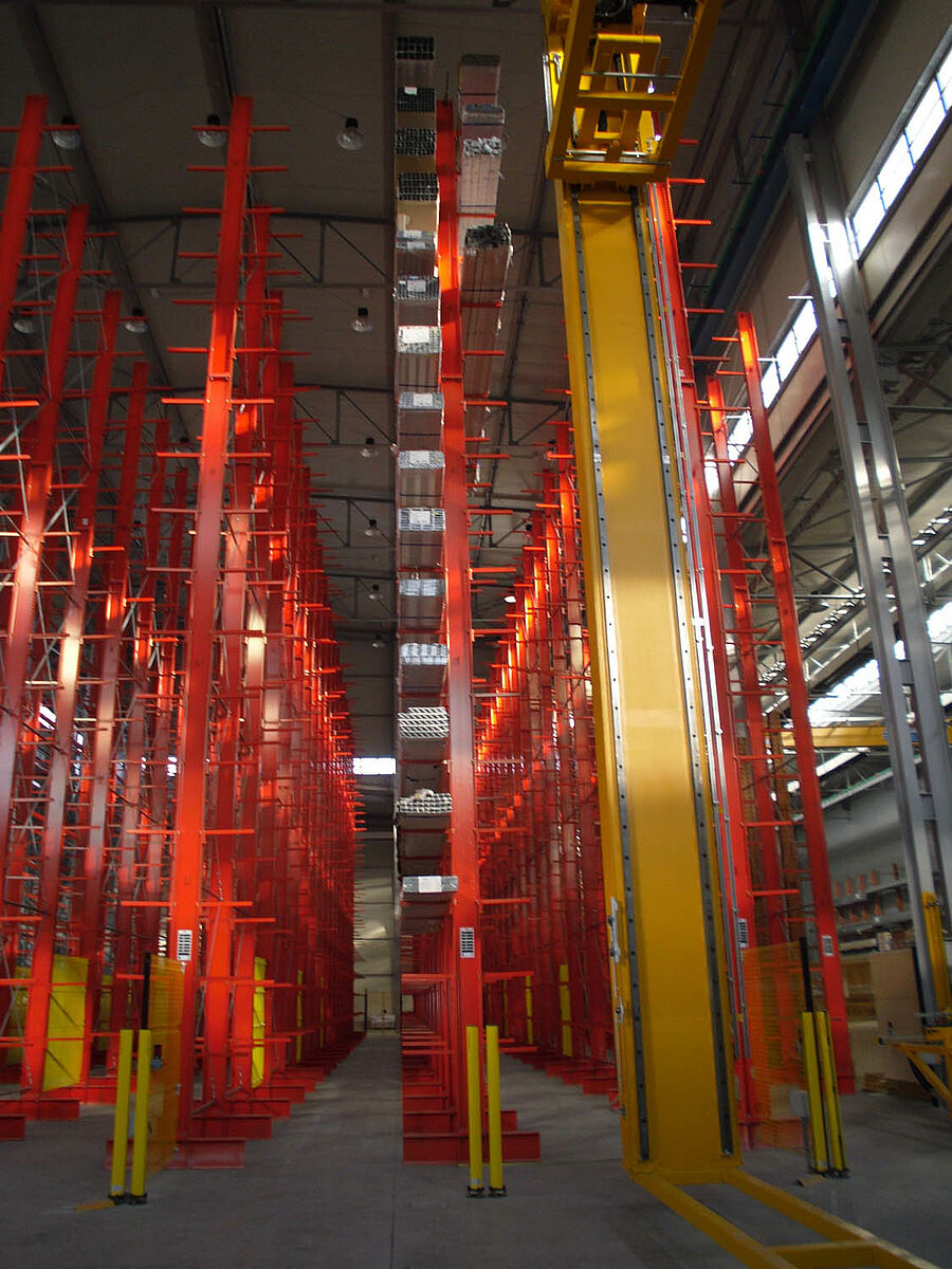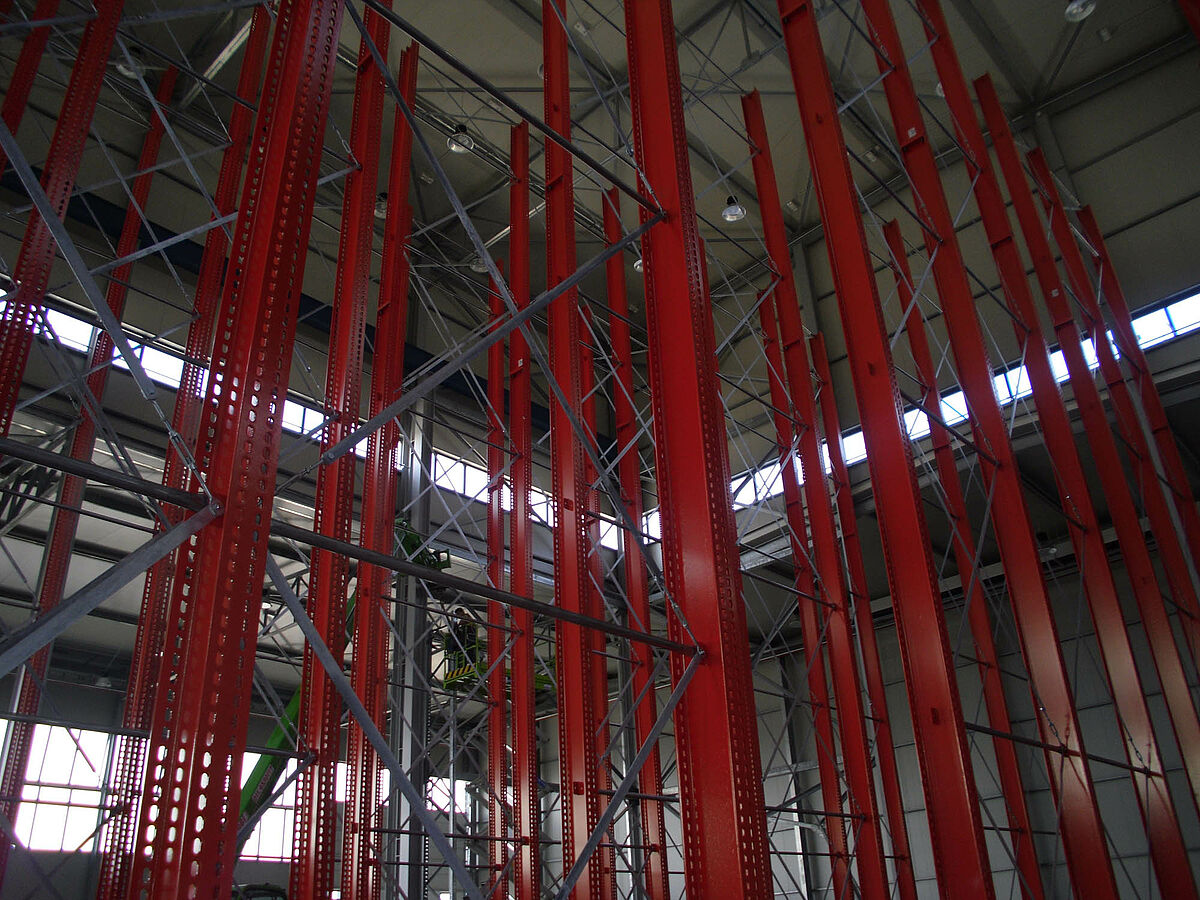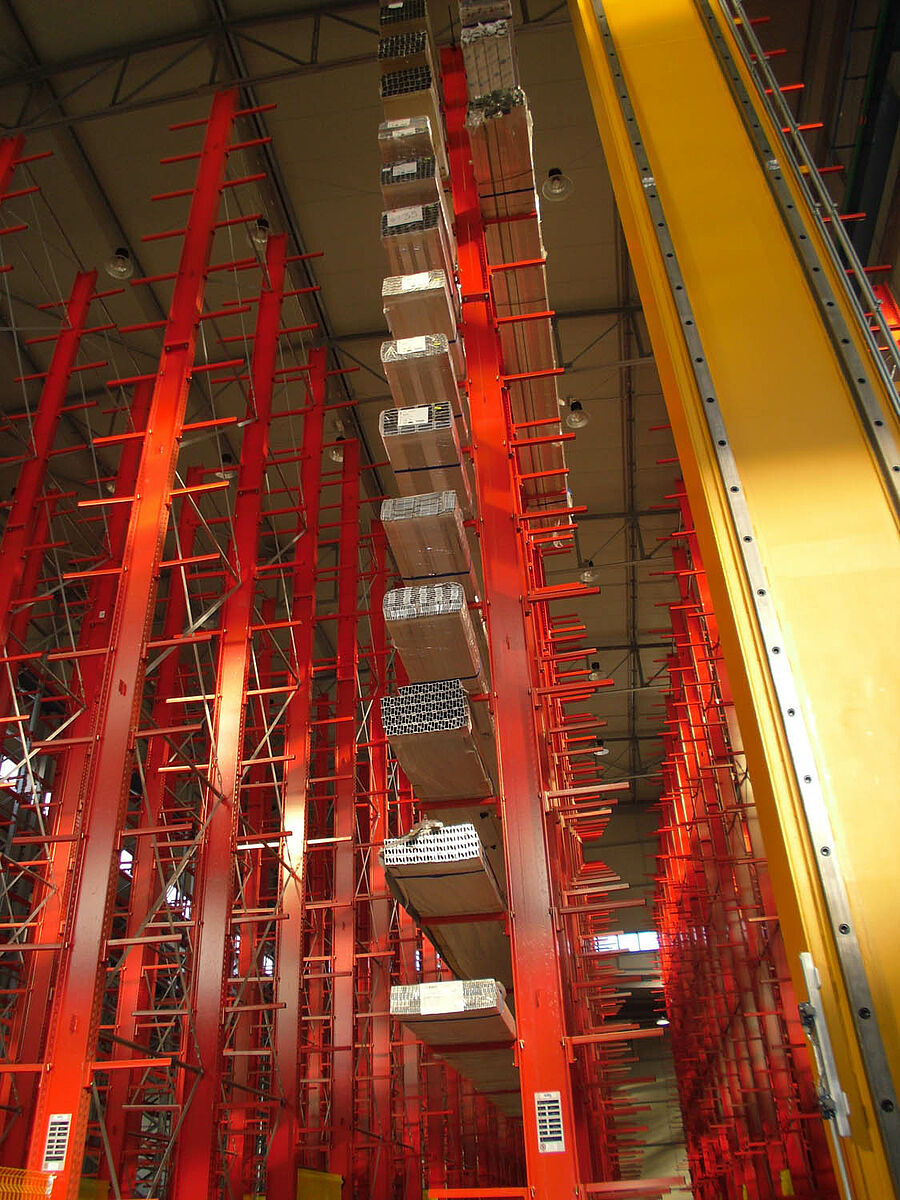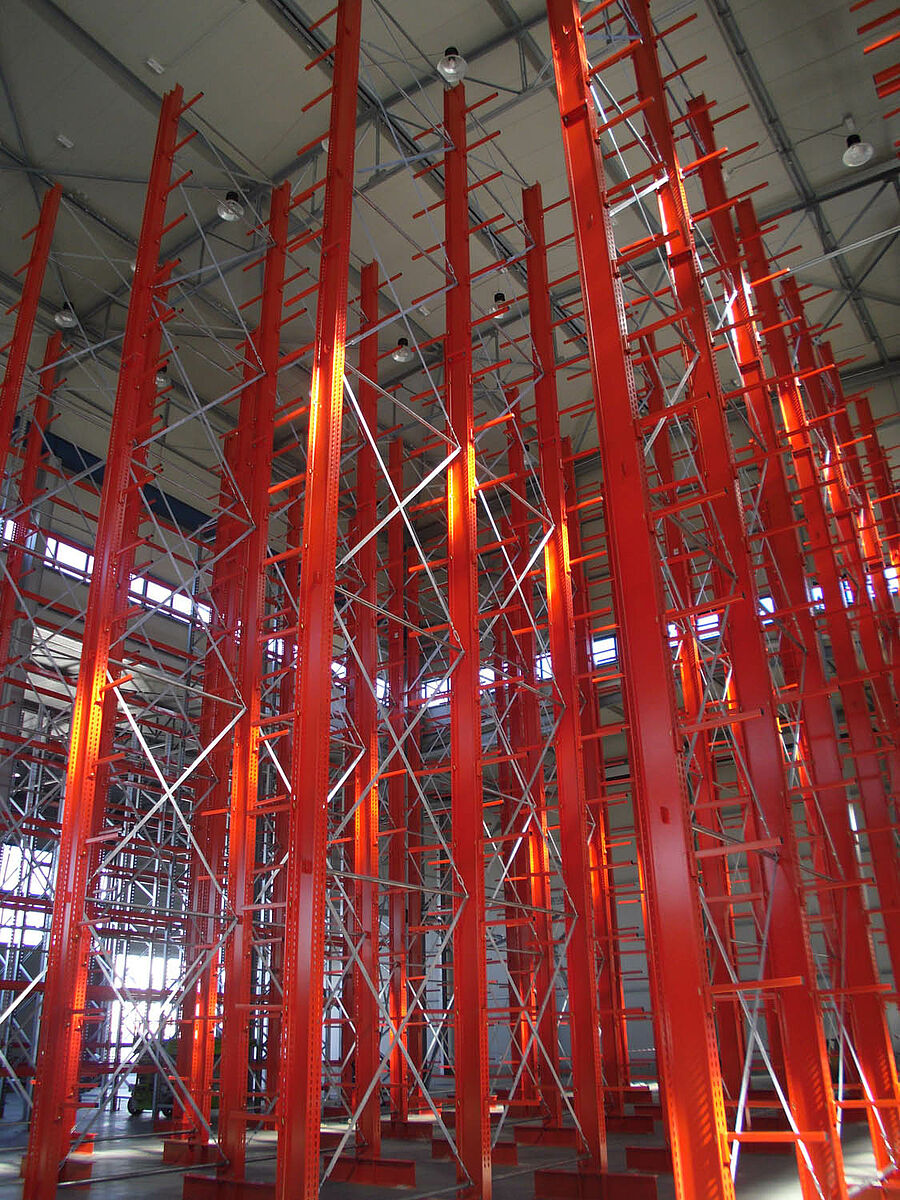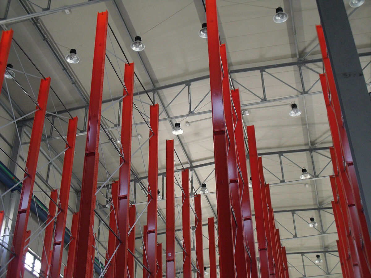 Con ello se beneficiaron los planificadores de las columnas estables fabricadas con perfiles de acero de alma llena de las estanterías de OHRA. Pues así se pudo aprovechar completamente la altura existente del espacio: A pesar de la altura de 13,7 metros las columnas se encuentran libres en el espacio de forma que no se incomoda al sistema de grúa, igualmente la curva máxima permitida de 1/200 no se excede en el extremo de la columna incluso con carga completa. Además, gracias a las columnas estables en comparación con la planificación inicial y con las ofertas de la competencia, se pudo integrar una fila adicional de estanterías de una cara. Esto corresponde a un aumento de aproximadamente 10 por ciento de la capacidad de almacenamiento.