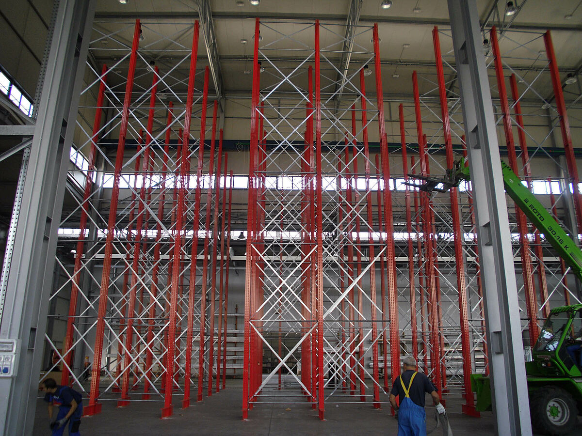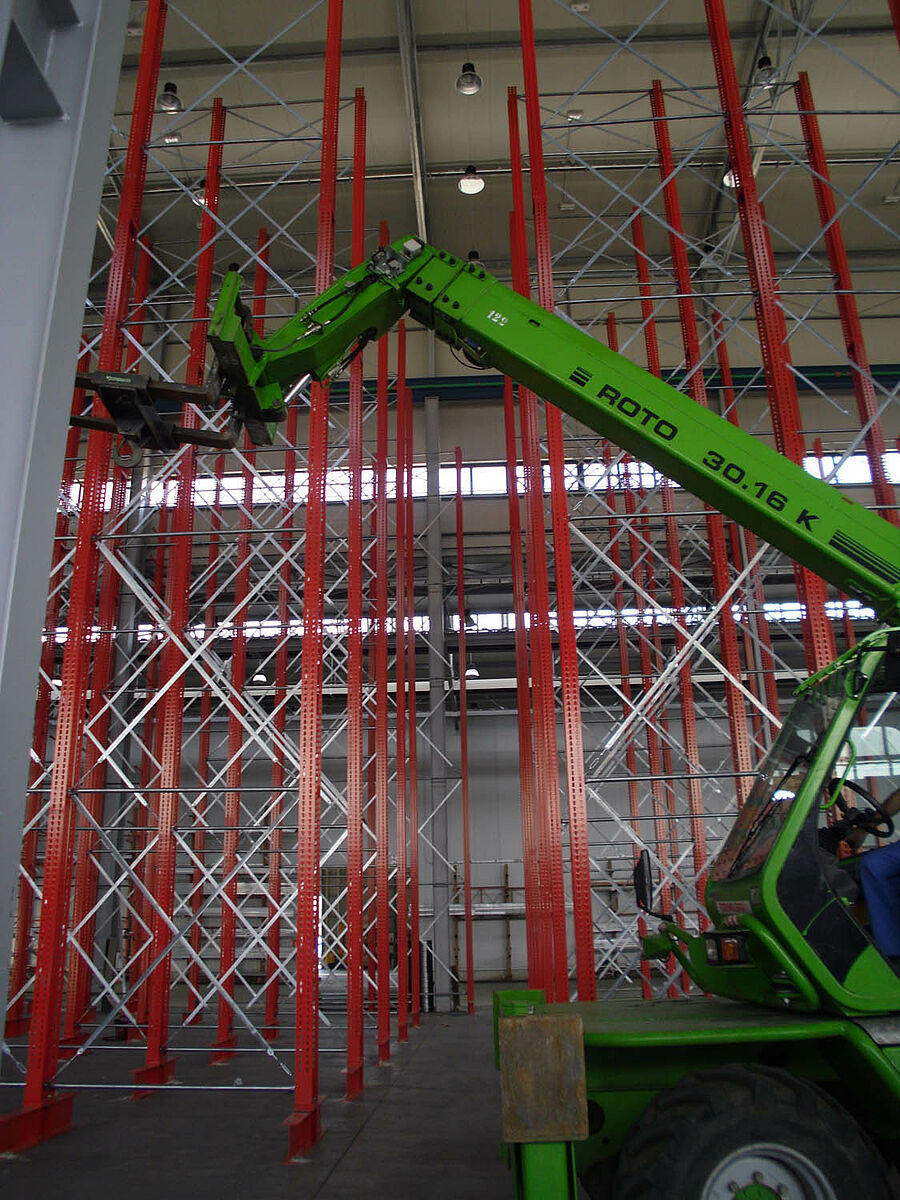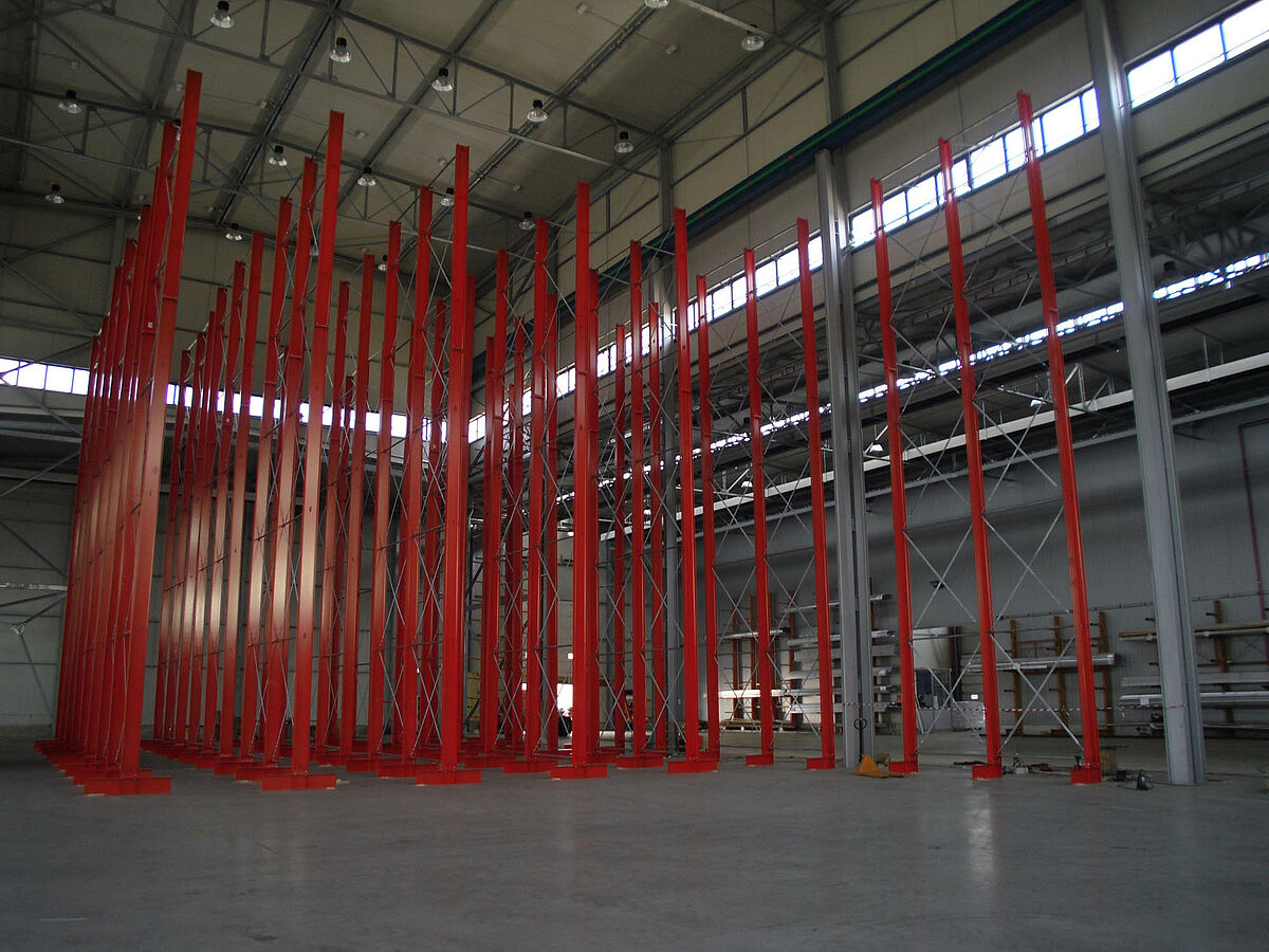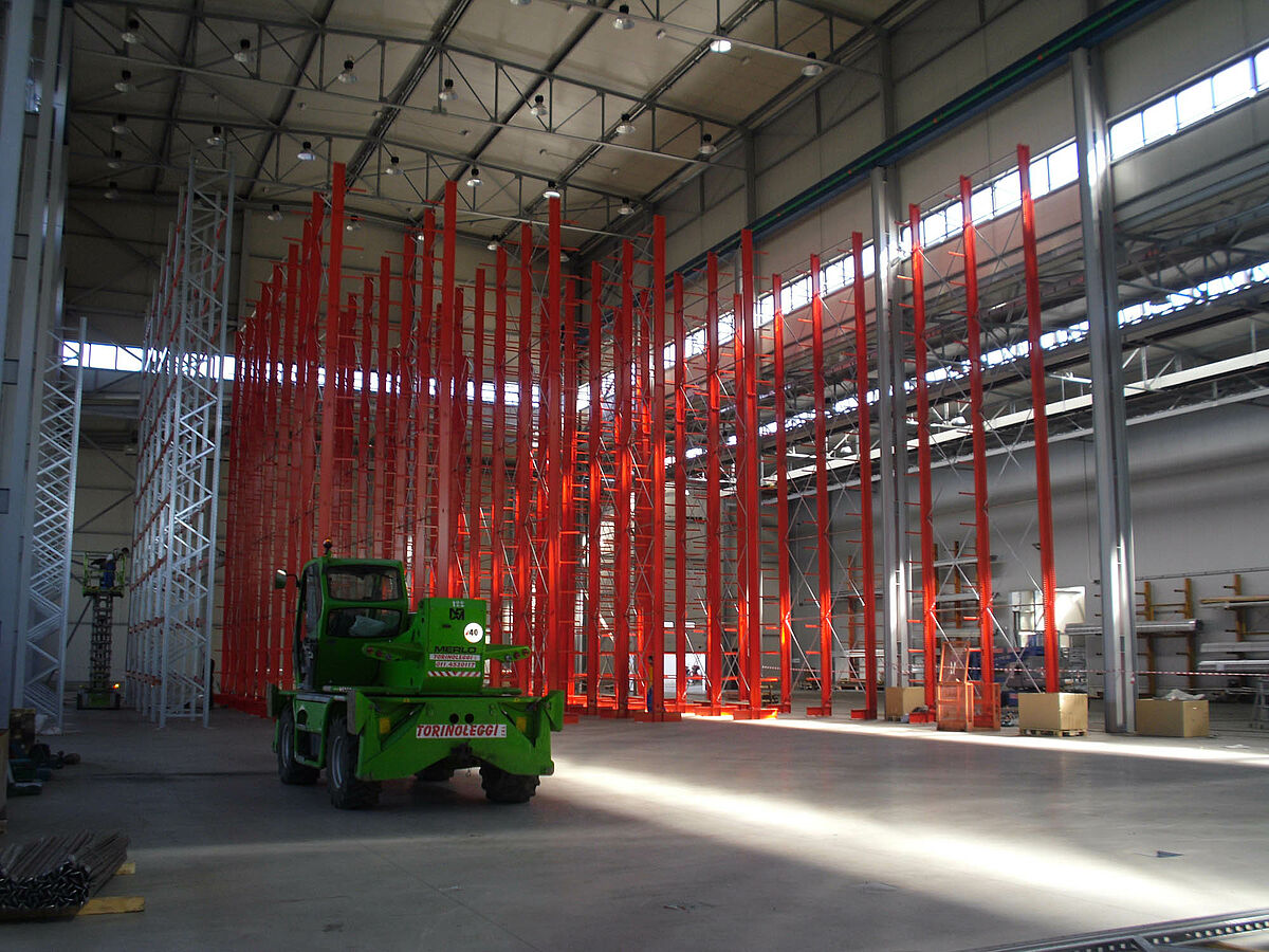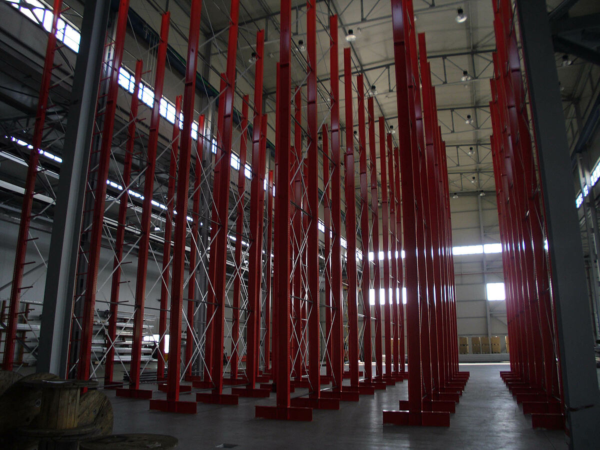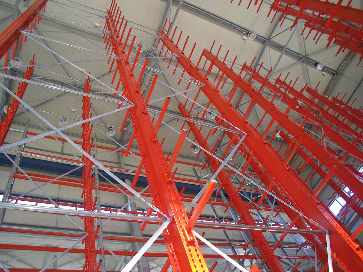 Con ello se beneficiaron los planificadores de las columnas estables fabricadas con perfiles de acero de alma llena de las estanterías de OHRA. Pues así se pudo aprovechar completamente la altura existente del espacio: A pesar de la altura de 13,7 metros las columnas se encuentran libres en el espacio de forma que no se incomoda al sistema de grúa, igualmente la curva máxima permitida de 1/200 no se excede en el extremo de la columna incluso con carga completa. Además, gracias a las columnas estables en comparación con la planificación inicial y con las ofertas de la competencia, se pudo integrar una fila adicional de estanterías de una cara. Esto corresponde a un aumento de aproximadamente 10 por ciento de la capacidad de almacenamiento.