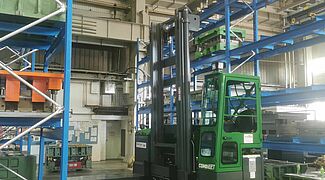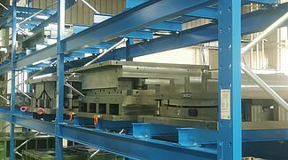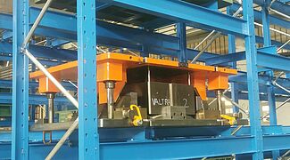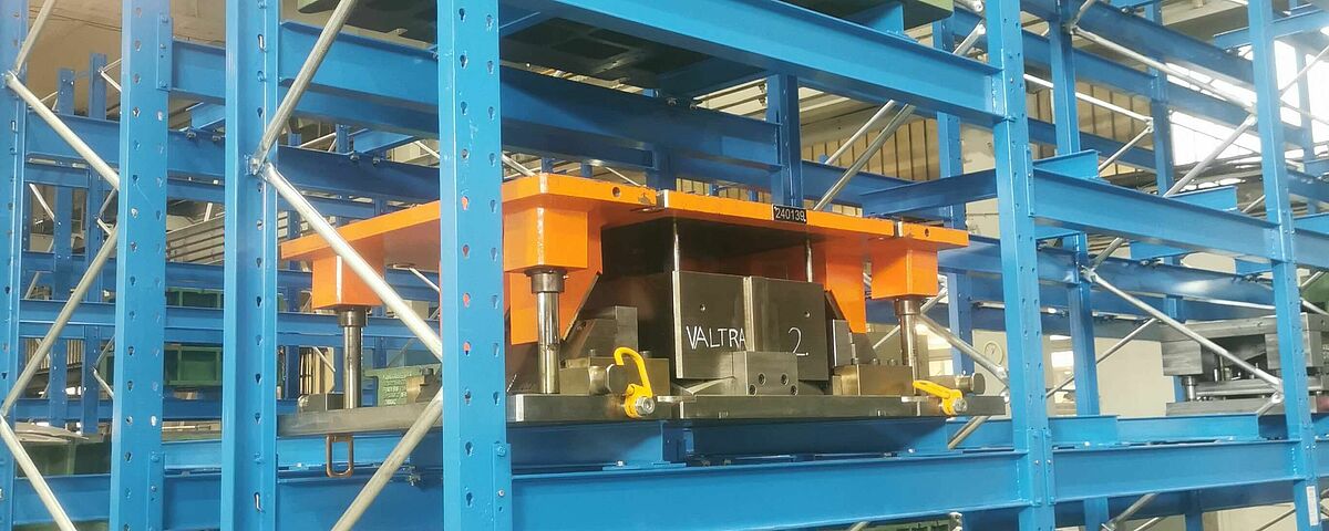 En comparación con el almacenamiento alternativo en el suelo, Solvaro puede almacenar una cantidad significativamente mayor de herramientas de embutición profunda en el espacio disponible con el nuevo sistema de estanterías. Sin embargo, lo más importante es el acceso directo y rápido a las herramientas: Una carretilla elevadora especial de Combilift, adquirida especialmente para las herramientas de embutición, puede levantar fácilmente las pesadas herramientas de la estantería y trasladarlas directamente a la prensa. Al mismo tiempo, las herramientas de embutición profunda están protegidas de daños en todo momento gracias a la construcción a medida de la estantería.