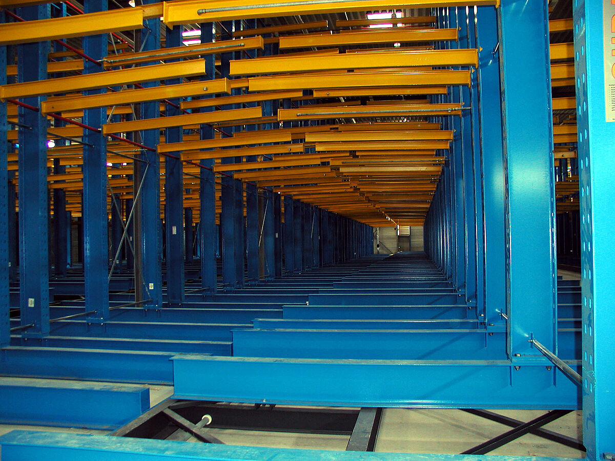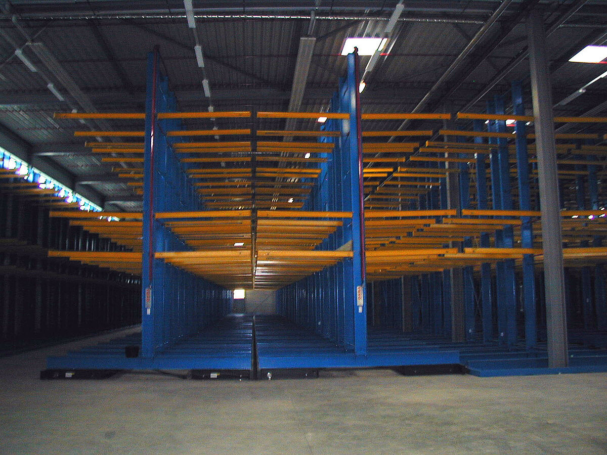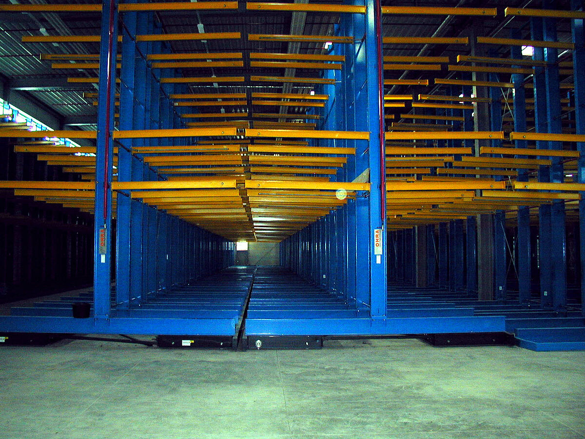 Por el gran volumen es especialmente difícil almacenar los bastidores porque deben quedar de manera que los decorados se puedan cambiar rápido y asequibles para el acceso directo. Al final se solucionó con una instalación de estanterías cantiléver sobre bases móviles. En los brazos de 2,5 m de longitud se ponen las paletas grandes (2,2 x 6 m) en 3 niveles con una altura de ubicación de 2,1 m cada uno. En el teatro Estatal de Karlsruhe se emplearon 6 bases móviles con una longitud de 60 m cada uno para las estanterías cantiléver bilaterales. Las altas exigencias de protección contra incendios se pudieron cumplir mediante un sistema de mangueras flexibles unidas a las instalaciones de rociadores, soldadas a las estanterías móviles, gracias a la experiencia que OHRA ya adquirió en el almacén de decorados en la Ópera de Zurich.
