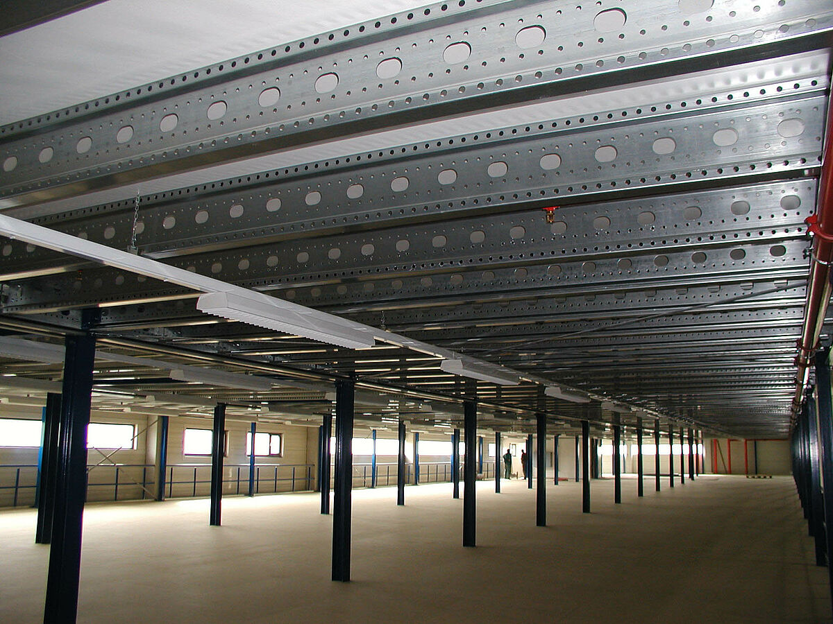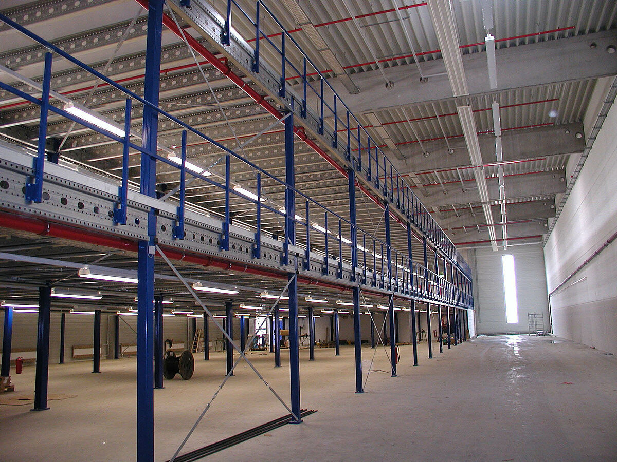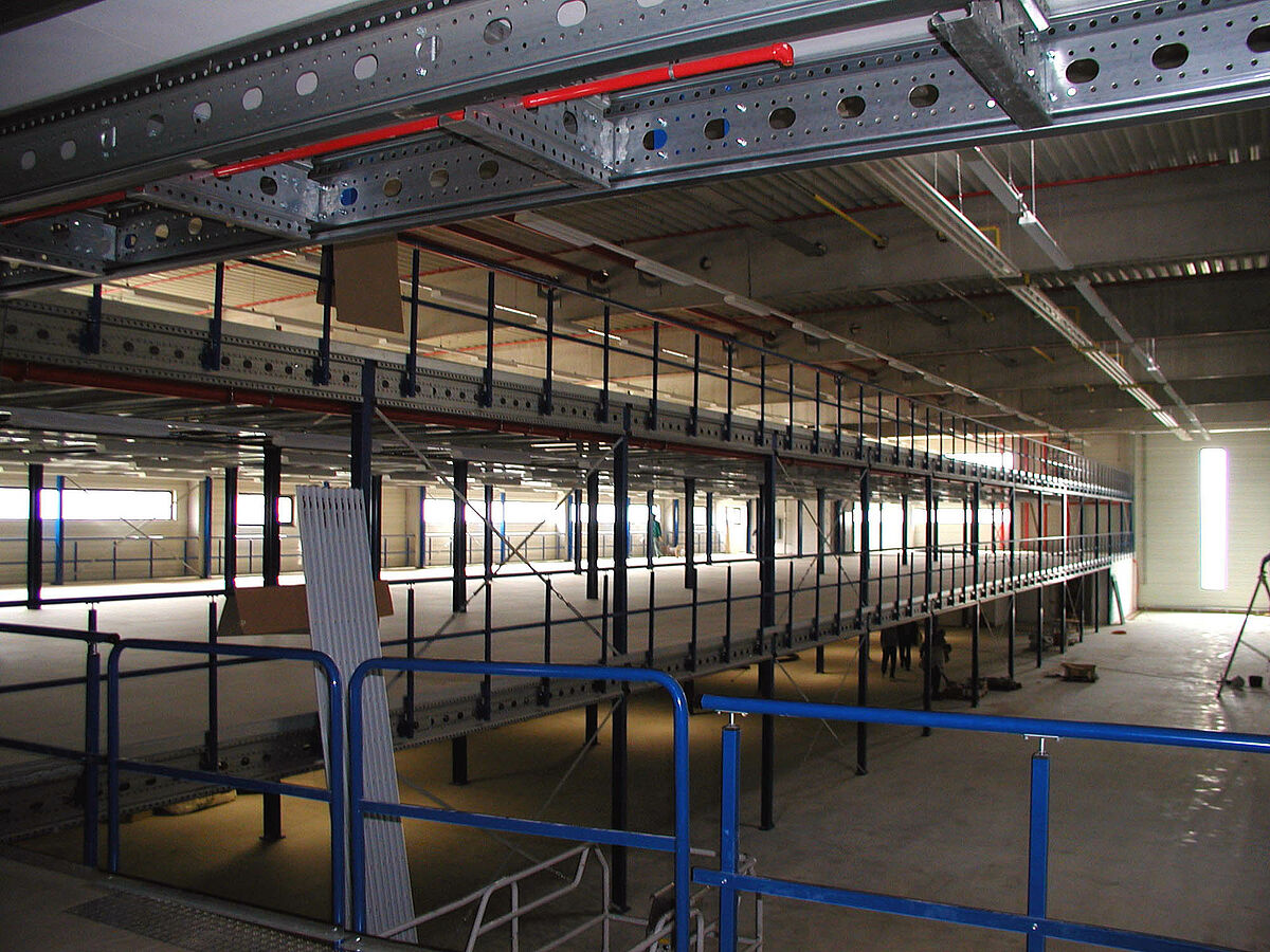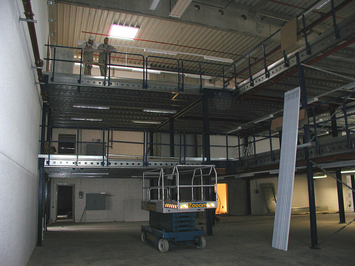 Se encontró la solución para almacenar los trajes en forma de una plataforma de dos pisos con una superficie total de 3.200 m². Estanterías de ángulo ranurado y estructuras móviles almacenan vestuarios. La construcción de la plataforma triplica ahora la superficie básica y también se puede desmontar si es necesario. Es un concepto pensado para el futuro y flexible para un edificio de almacenaje.