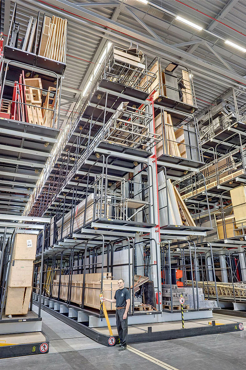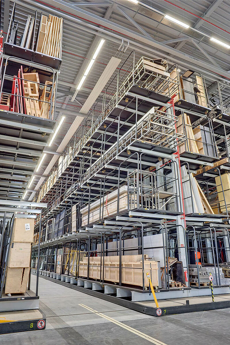 Los 8 estantes voladizos desplazables con casi 60 m de longitud tienen cada uno una capacidad de carga de 180 toneladas. El almacenamiento y desocupación de los carros de bastidores se realiza con una carretilla elevadora para cuatro direcciones con cabina desplazable hacia arriba.