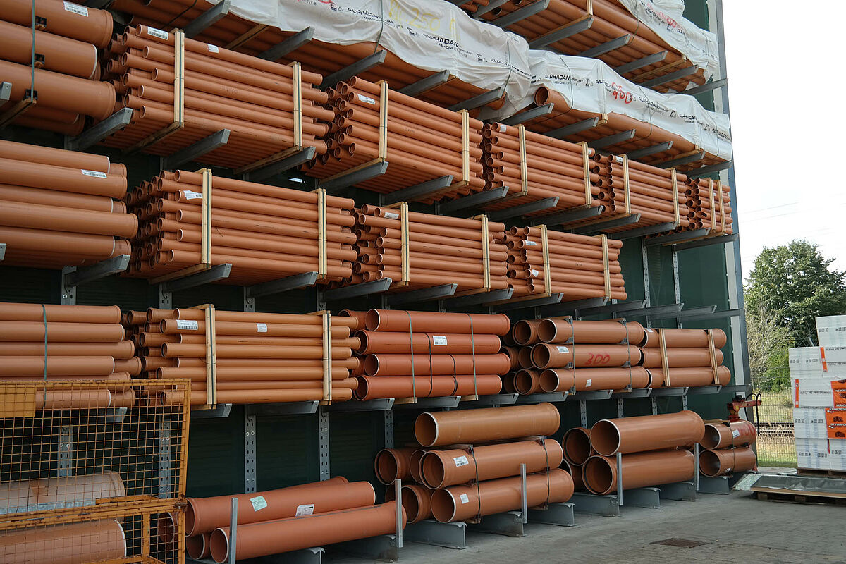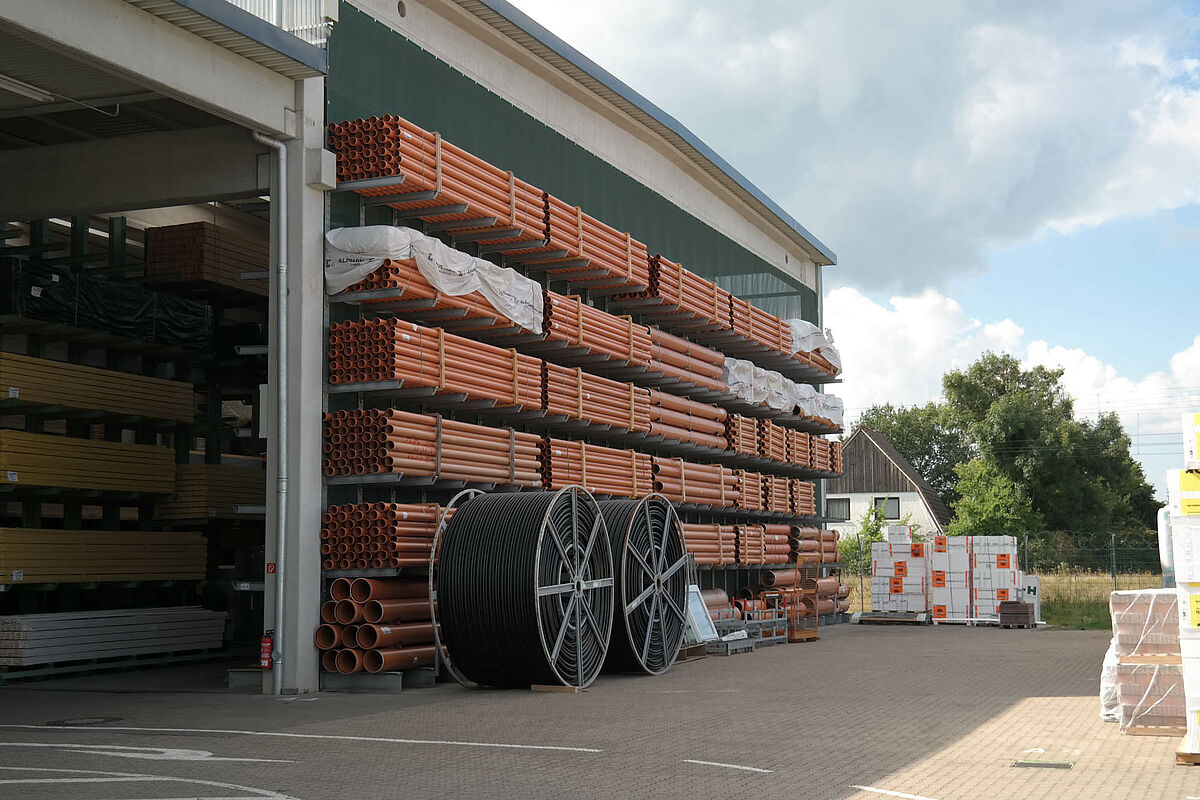 La empresa teambaucenter en Eggebek, líder en los sectores de comercio de materiales y materiales de construcción de Alemania del Norte pudo aumentar claramente la calidad del almacenamiento de sus mercancías con una nueva planta de almacenamiento. Ahora los productos están protegidos de las condiciones meteorológicas. Las estanterías cantiléver y para palés fabricadas a medida para los diferentes artículos por la empresa OHRA, especialista en almacenamiento de Kerpen, reducen los daños en la mercancía almacenada.