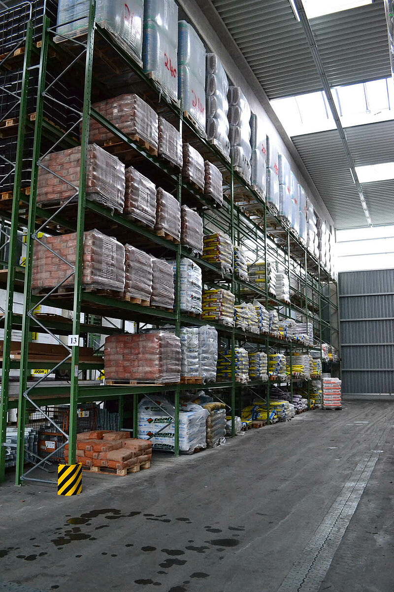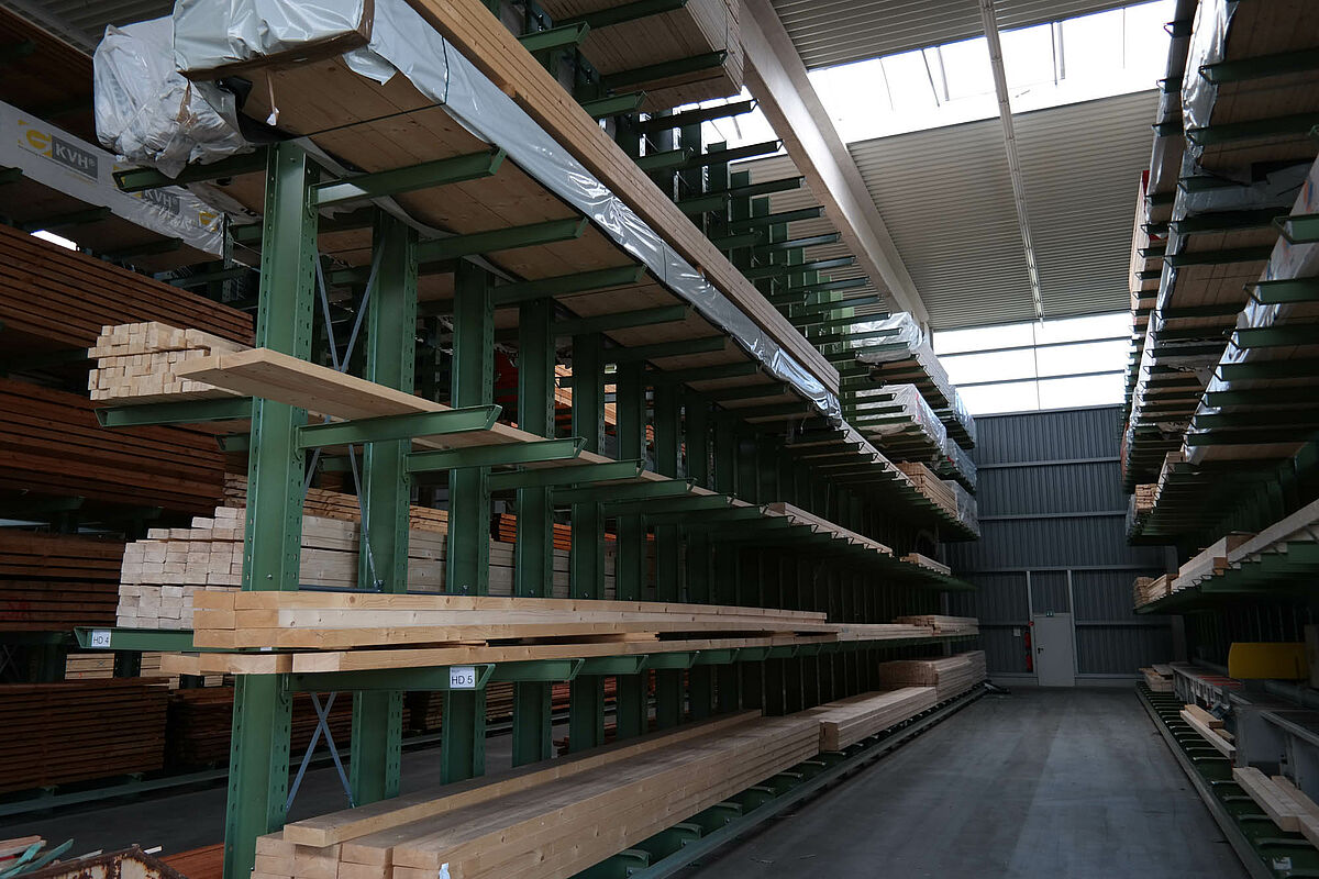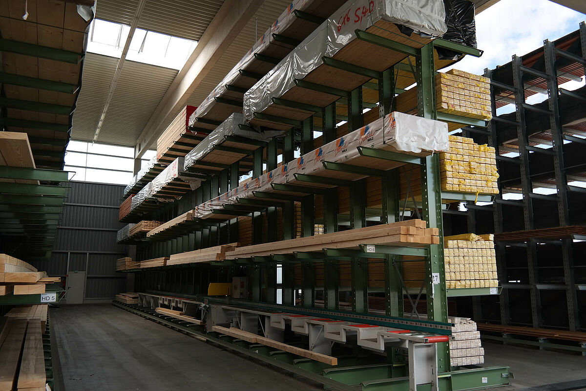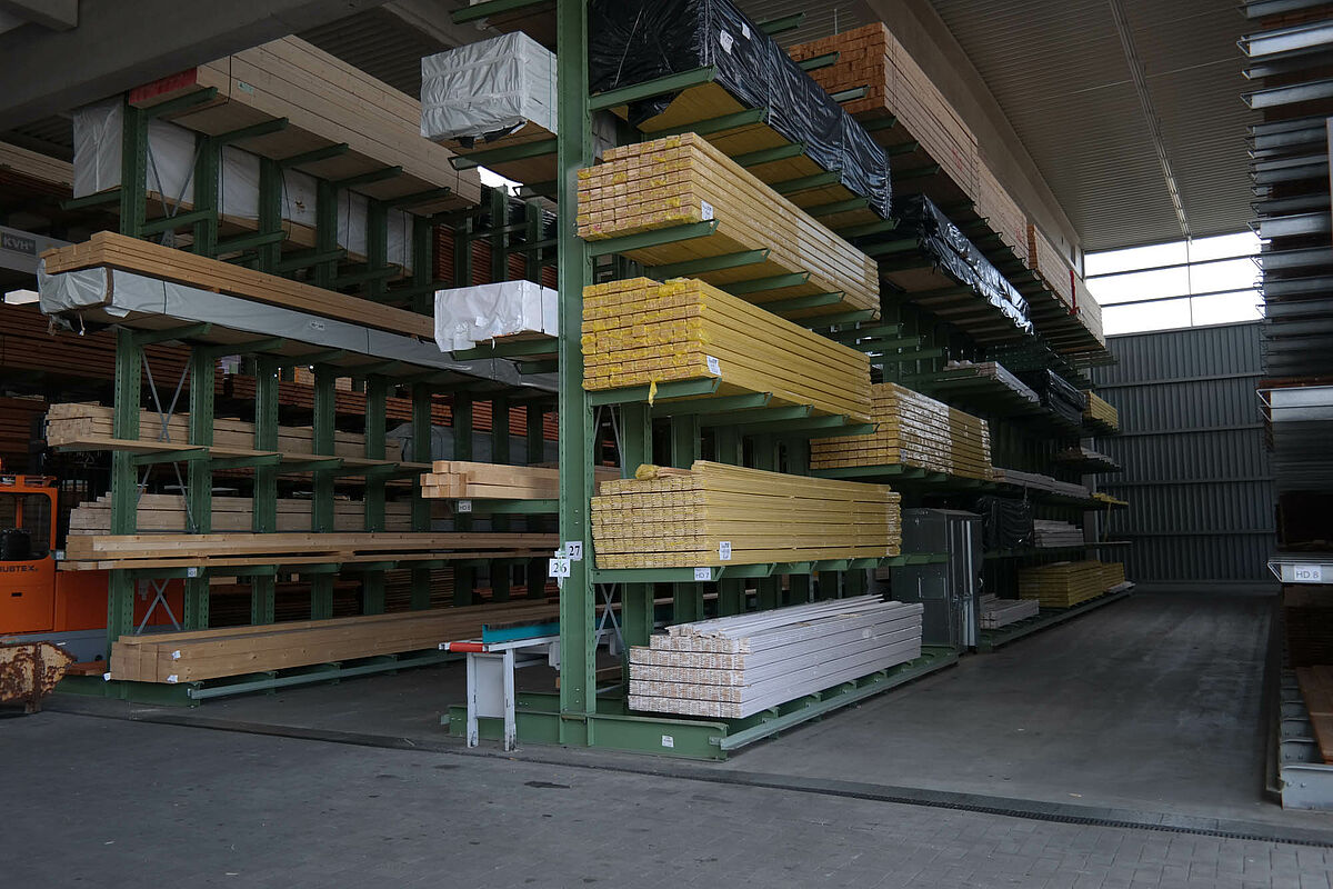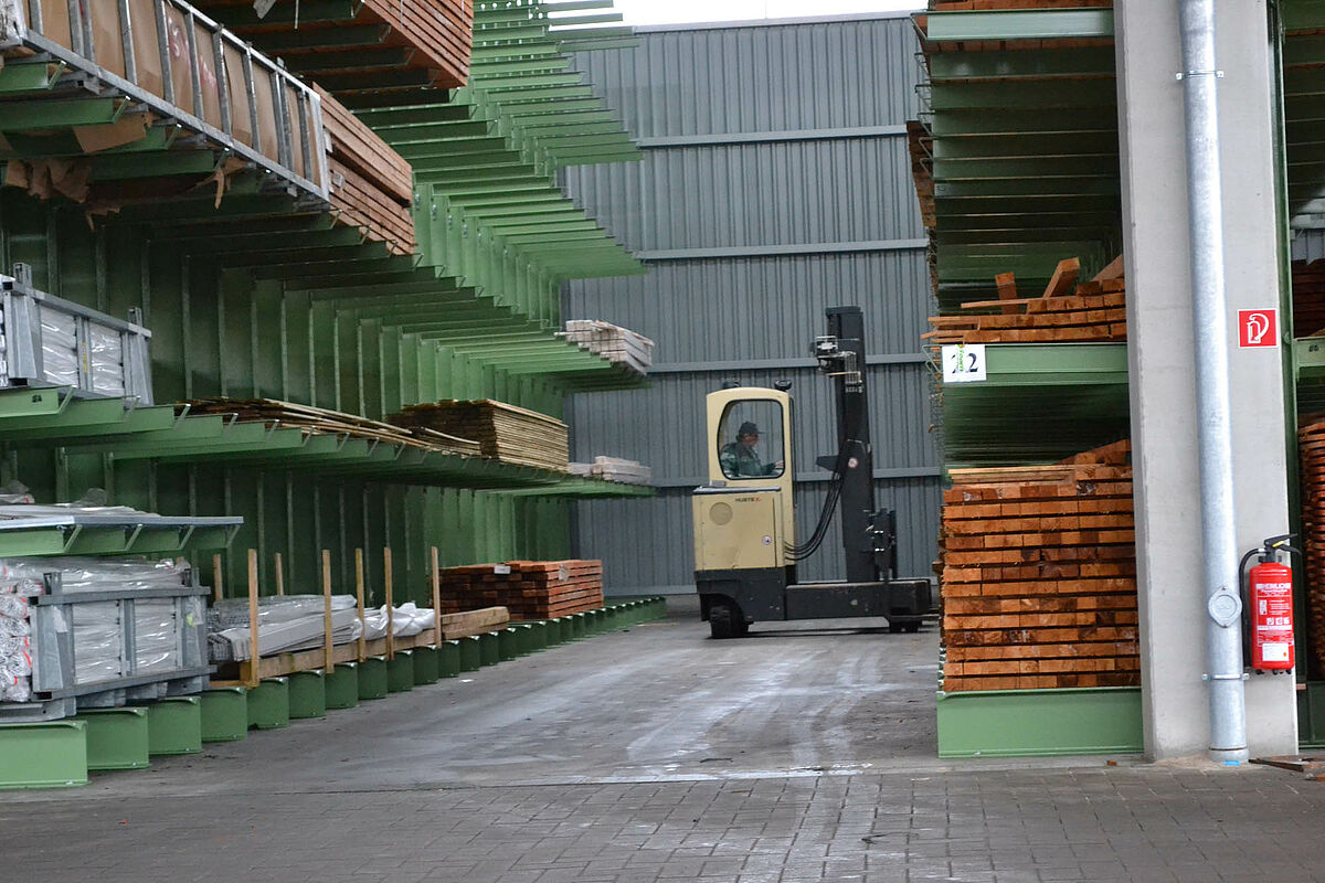 Hasta ahora el centro de construcción almacenaba los materiales en un almacén en bloque techado sólo parcialmente. Aparte de eso, las maderas de hasta 13 metros de largo se almacenaban en una estantería en el exterior. Pero las capacidades de almacenamiento bajo techo eran sólo escasas y la madera quedaba en parte expuesta a las condiciones meteorológicas. Al transportar las mercancías en el almacén de bloque los productos siempre resultaban dañados.