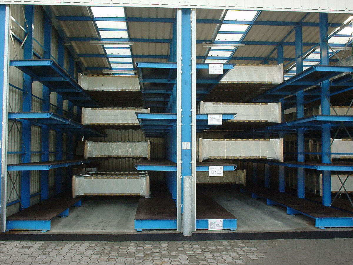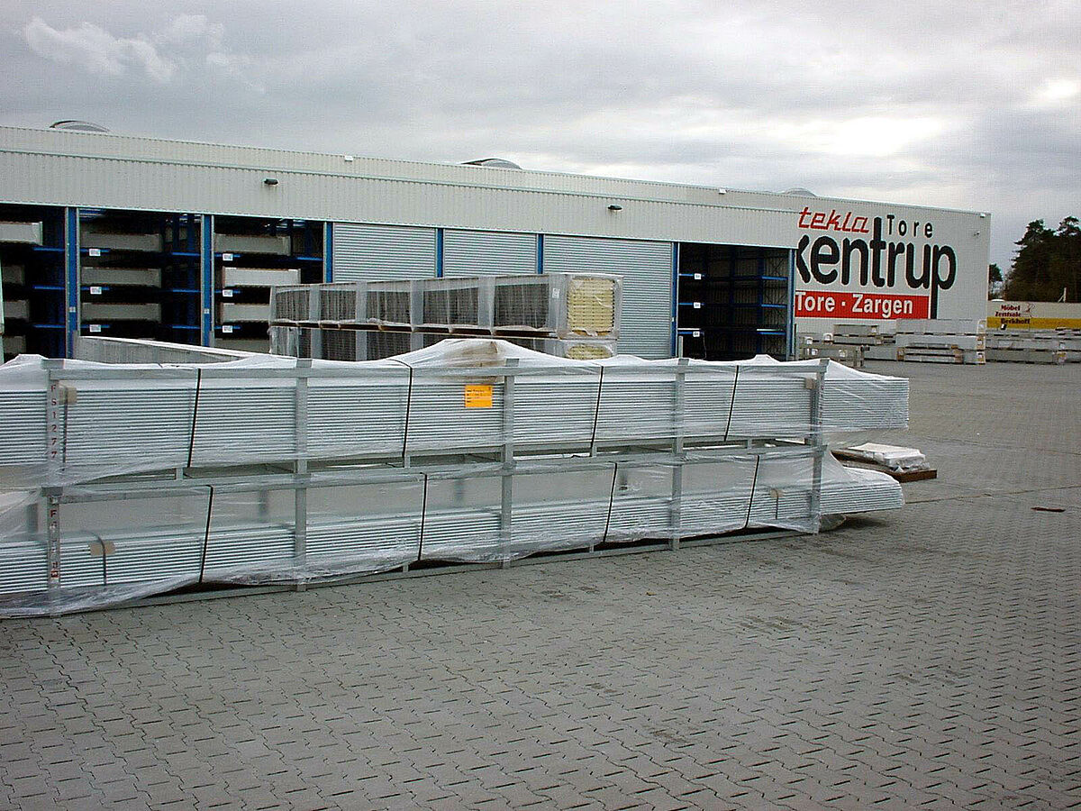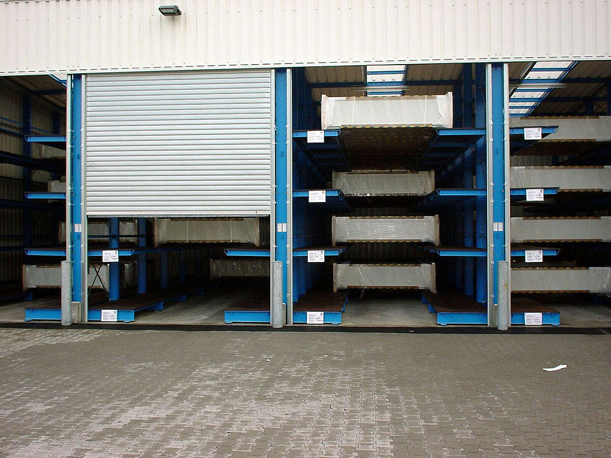 Por el gran éxito de venta era necesario la ampliación del almacén de productos acabados teniendo en cuenta las exigencias especiales del almacenamiento de pequeñas series. Después de algunas reuniones con el cliente, se ha desarrollado una nueva instalación de estanterías de almacenamiento compacto a base de las estanterías cantiléver que permite recibir puertas de una anchura de 4,2 m hasta 6,5 m.
