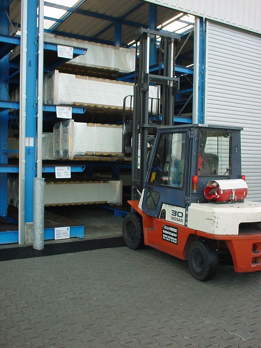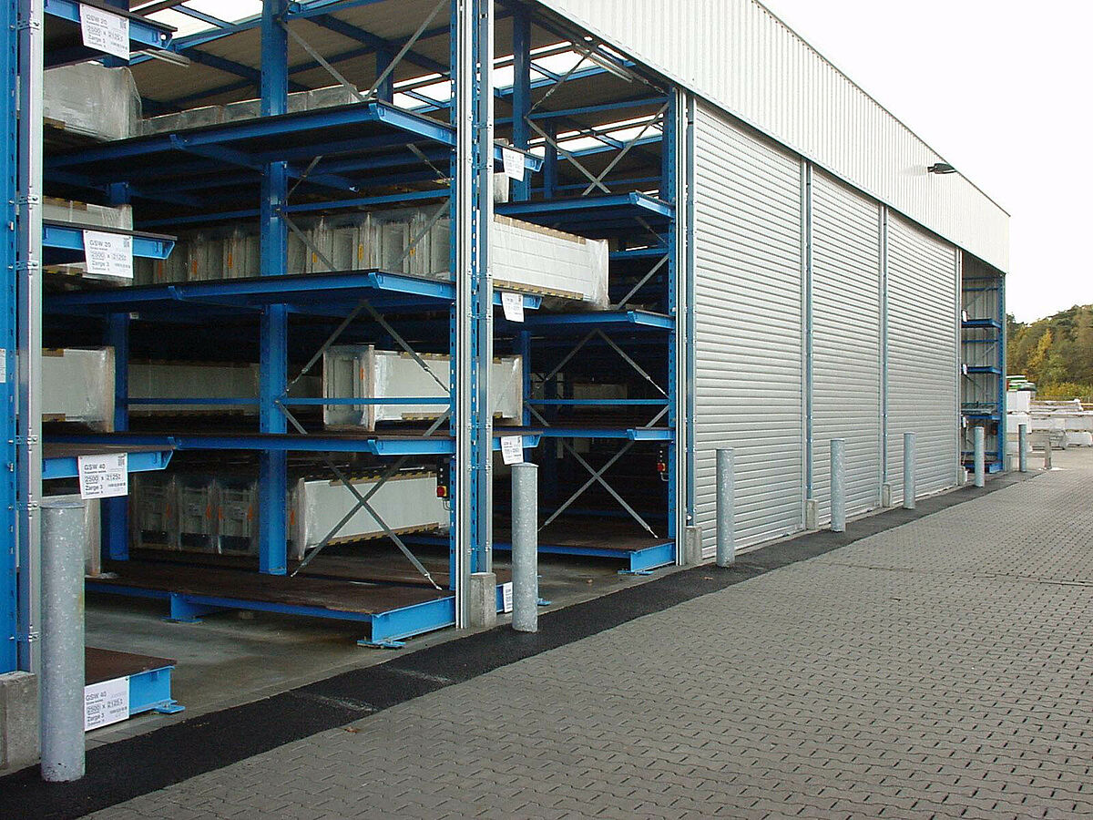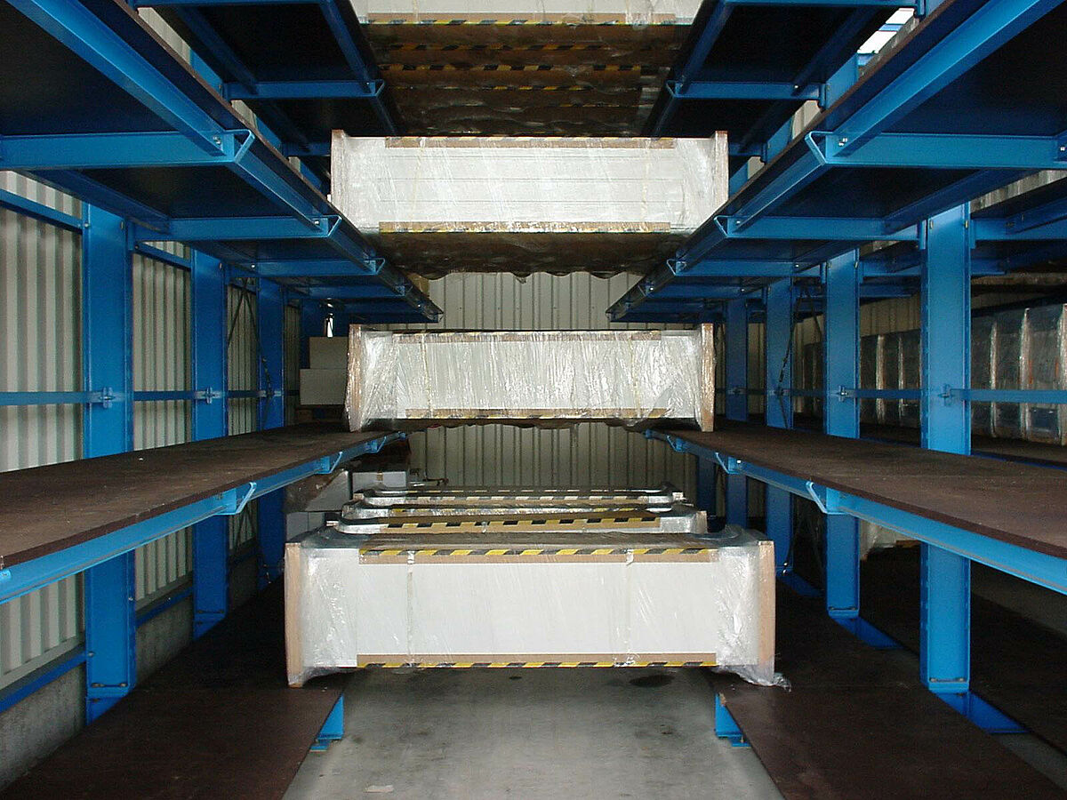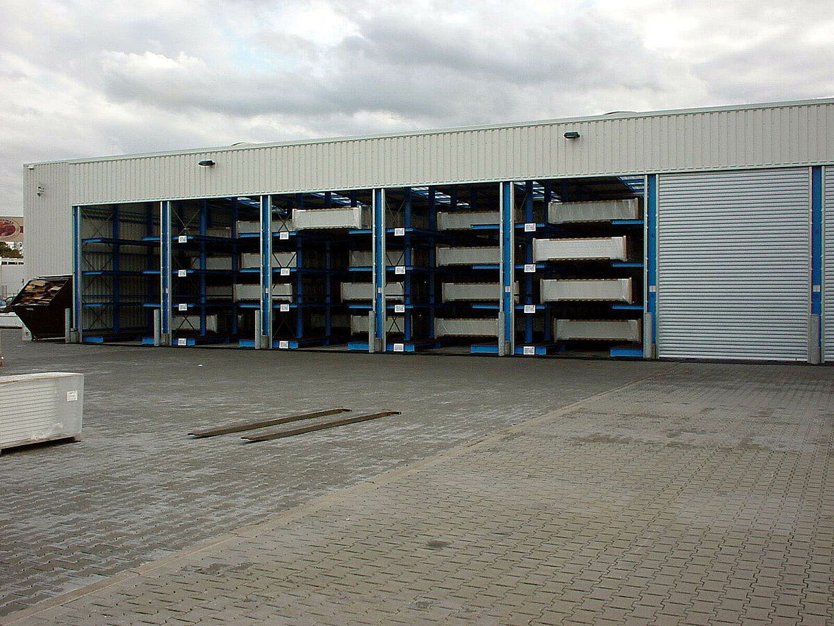 Por el gran éxito de venta era necesario la ampliación del almacén de productos acabados teniendo en cuenta las exigencias especiales del almacenamiento de pequeñas series. Después de algunas reuniones con el cliente, se ha desarrollado una nueva instalación de estanterías de almacenamiento compacto a base de las estanterías cantiléver que permite recibir puertas de una anchura de 4,2 m hasta 6,5 m.