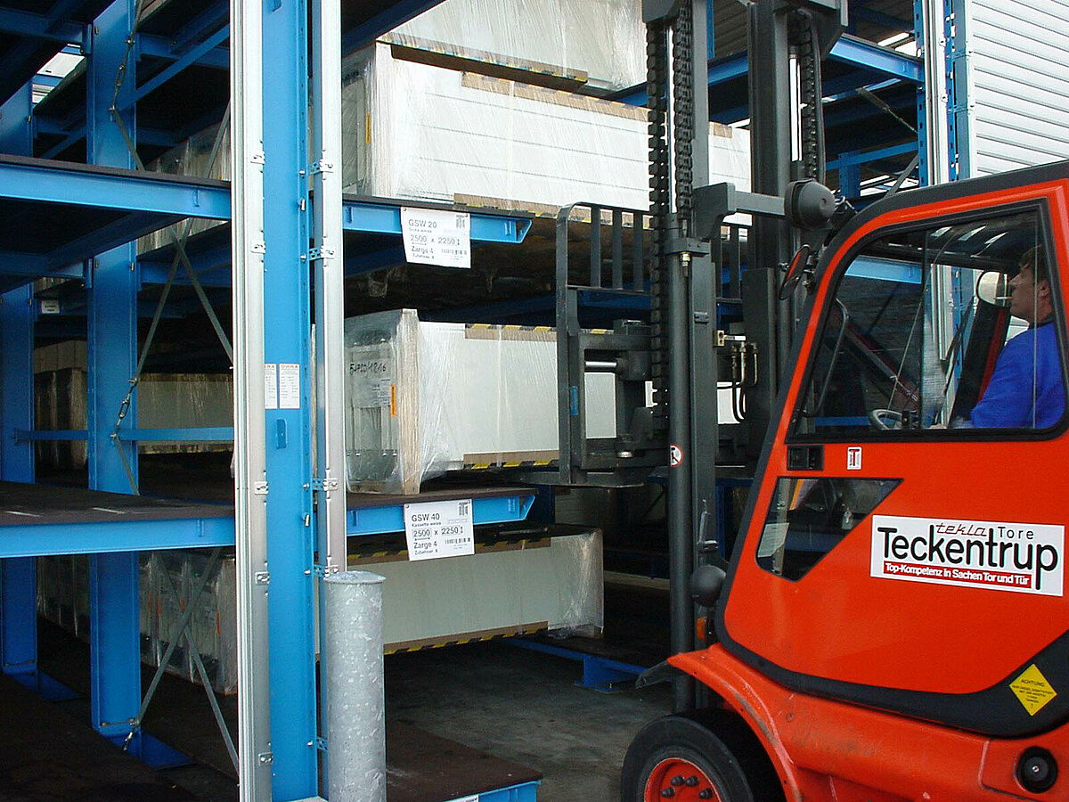 La empresa Tekla produce puertas, la mayoría de las veces a medida, en pequeñas series y en diferentes plantas en Alemania. En Verl se producen las puertas seccionales y plegables y se almacenan en estanterías OHRA para su distribución.