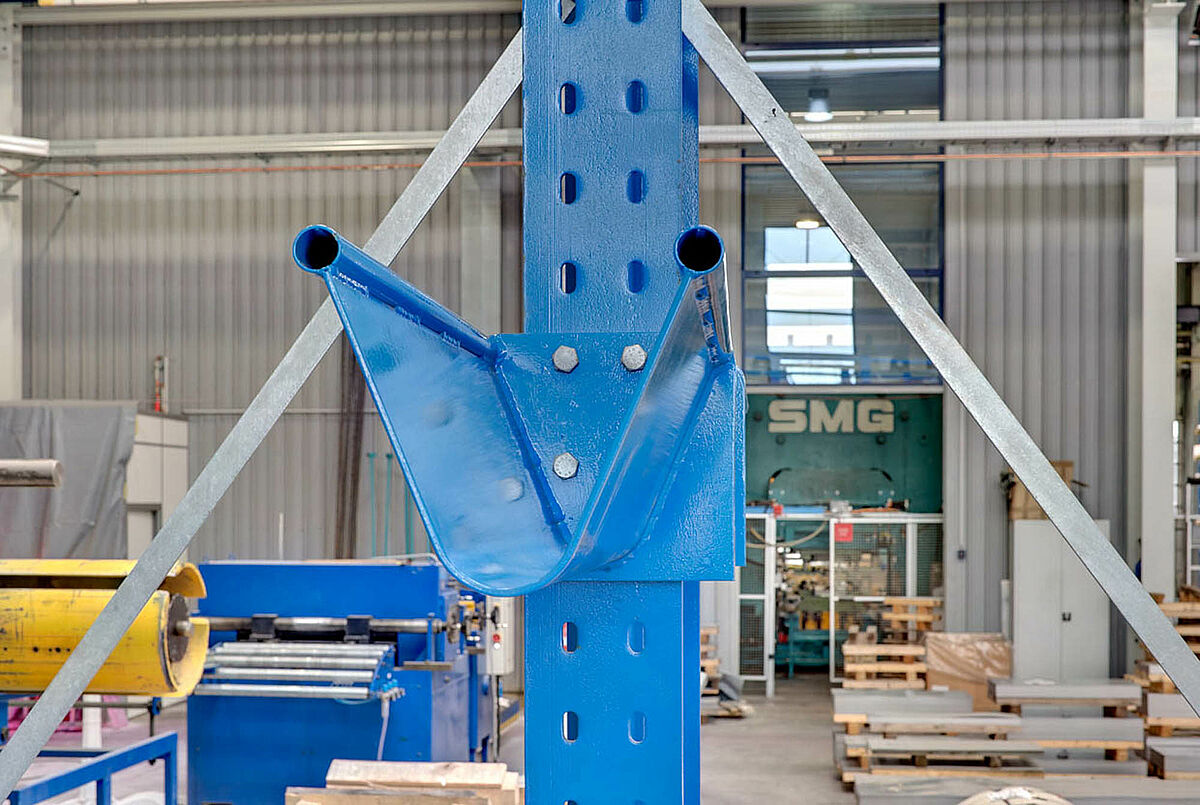 Para el almacenamiento de bobinas decidió la empresa THERMOWAVE usar estantería voladiza para bobinas de la empresa OHRA. El brazo de boninas especialmente desarrollado por la empresa OHRA tiene una capacidad de carga hasta 15 toneladas por cada brazo, y es especialmente adecuado para el almacenamiento de bobinas pesadas. La desocupación y el almacenamiento de bobinas se realizan con un gancho telescópico tipo C. Con eso se transportan las bobinas directamente desde el estante al equipo de corte. Luego aquí se cortan las planchas a la longitud requerida y después se transfieren por ejemplo para el estampado sobre una prensa.