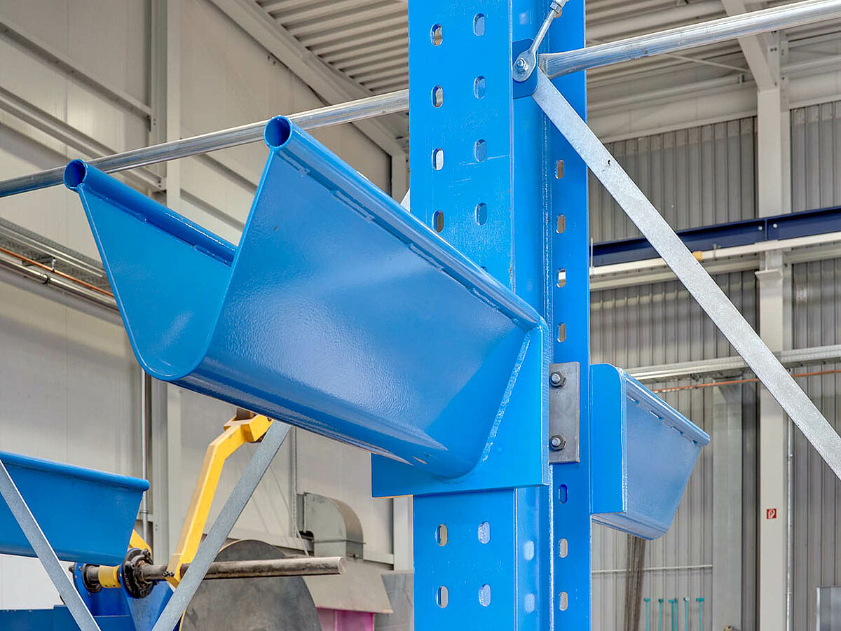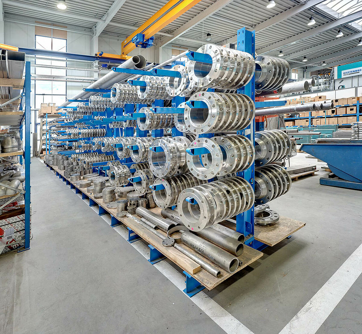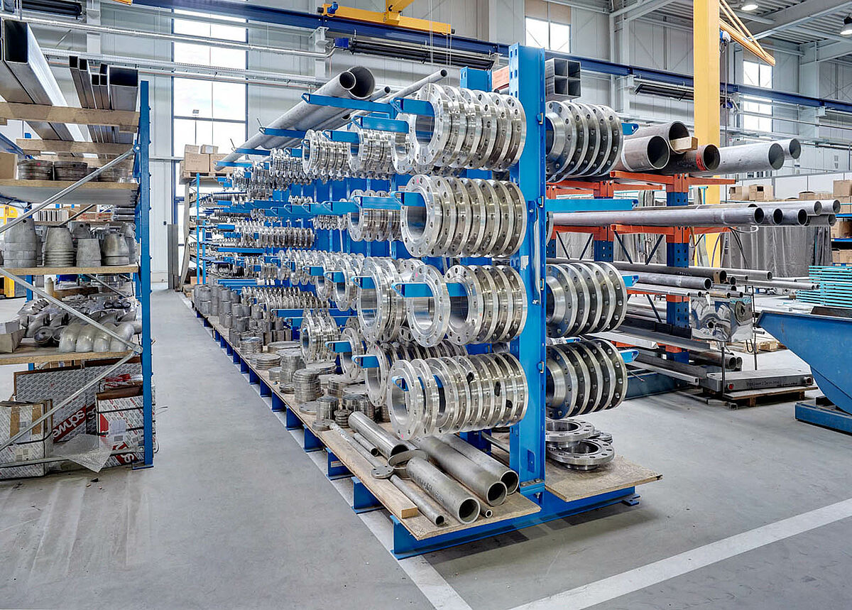 Adicionalmente al material no procesado, también se almacenan piezas de trabajo como por ejemplo bridas en estantería voladiza robusta. Las bridas se necesitan para la conexión de los intercambiadores de calor fabricados. Cada transferencia de calor de planchas necesita 4 bridas. Por eso se necesitan siempre disponibles una gran cantidad de estas piezas de trabajo.