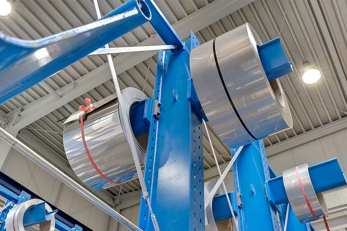 Para la fabricación de estos aparatos se usan planchas de acero, las cuales se despachan como bobinas y hay que almacenarlas antes de la fabricación. Las bobinas tienen, según su forma de construcción, diferentes anchuras fijas y también tienen diferentes pesos.