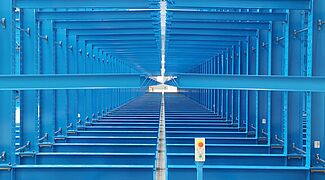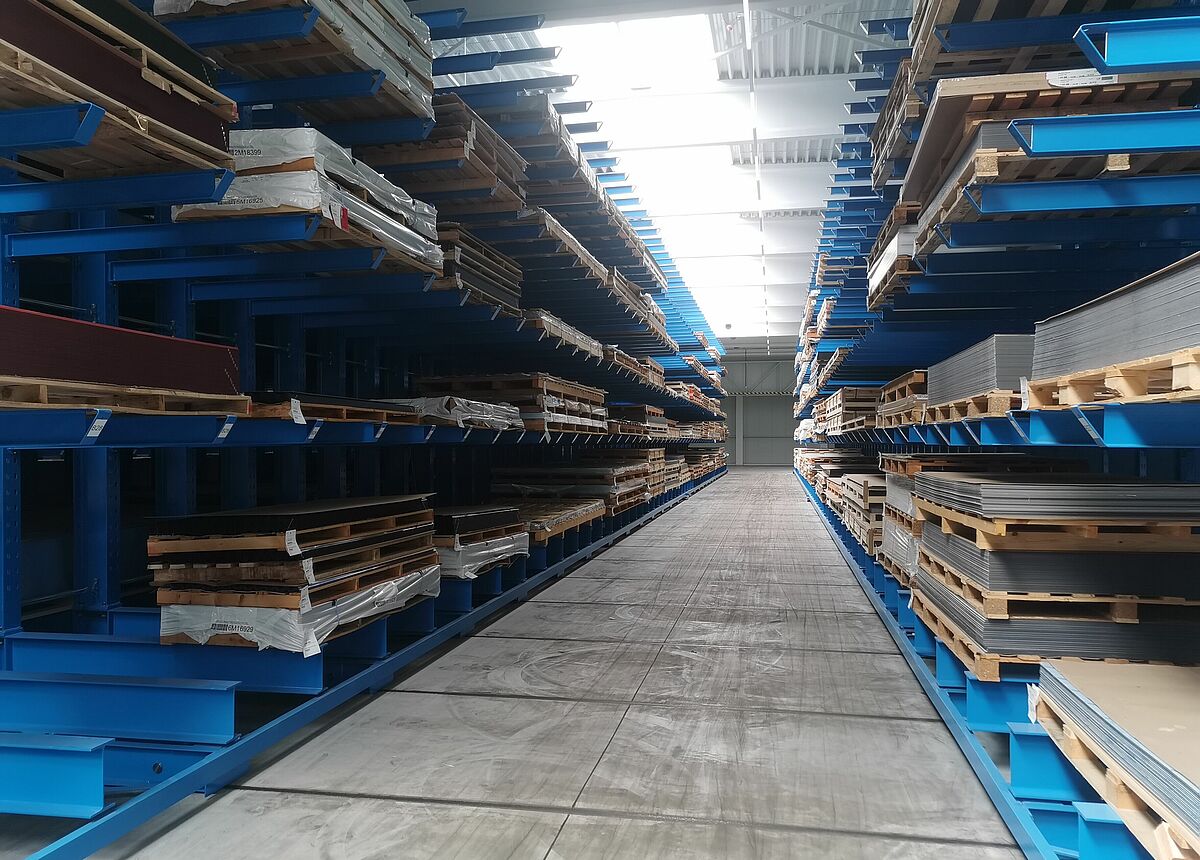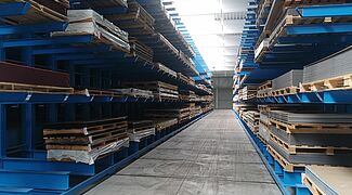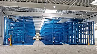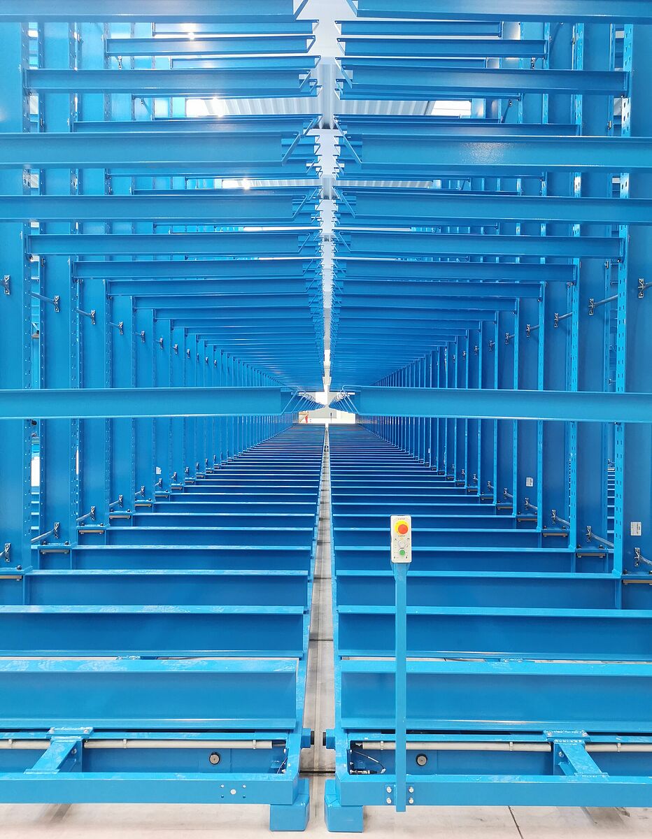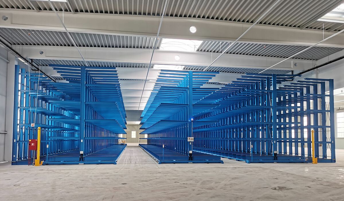 Consta de tres bloques estanterías cantiléver unilaterales fijas, así como de tres bloques de estanterías de bilaterales móviles. Al mover los lineales para formar un bloque de almacenamiento compacto, únicamente se abre un pasillo de estanterías a la vez para operar con un apilador multidireccional, por lo que el aprovechamiento del espacio es muy alto. Las estanterías móviles tienen casi 50 metros de longitud y 6,5 metros de altura cada una. Los brazos cantiléver de 2,1 metros de longitud forman cinco niveles de almacenamiento, cada uno de los cuales soporta una carga de hasta 800 kilogramos. En total, cada armazón puede cargar hasta 528 toneladas. A pesar de esta carga, las bases móviles se mueven a una velocidad de unos 4 metros por minuto, por lo que no hay que esperar mucho para que se abra el pasillo de servicio de 4,59 metros de ancho.