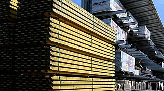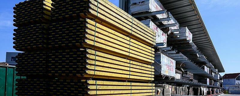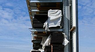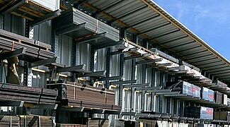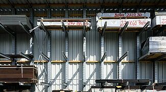 Un techo integrado de dos metros de longitud y la pared trasera revestida de chapa trapezoidal protegen de la intemperie los tableros contrachapados almacenados. Uno de los retos era que los tableros miden entre 3,3 por 2,4 y 0,6 por 0,3 metros. Para evitar que los tableros se solapen durante el almacenamiento, OHRA ha ajustado la distancia entre las columnas y la ha variado dentro de la estantería: entre 26 columnas es de 1.000 milímetros, entre los 27 restantes de 1.200 milímetros. De este modo, todos los formatos pueden almacenarse con seguridad y se aprovecha bien el espacio.