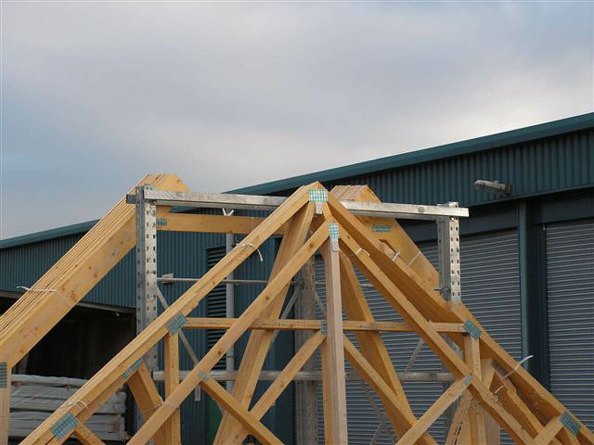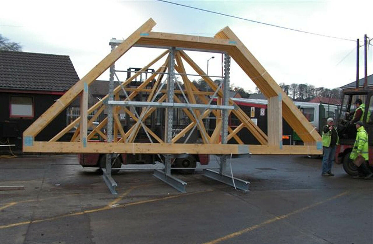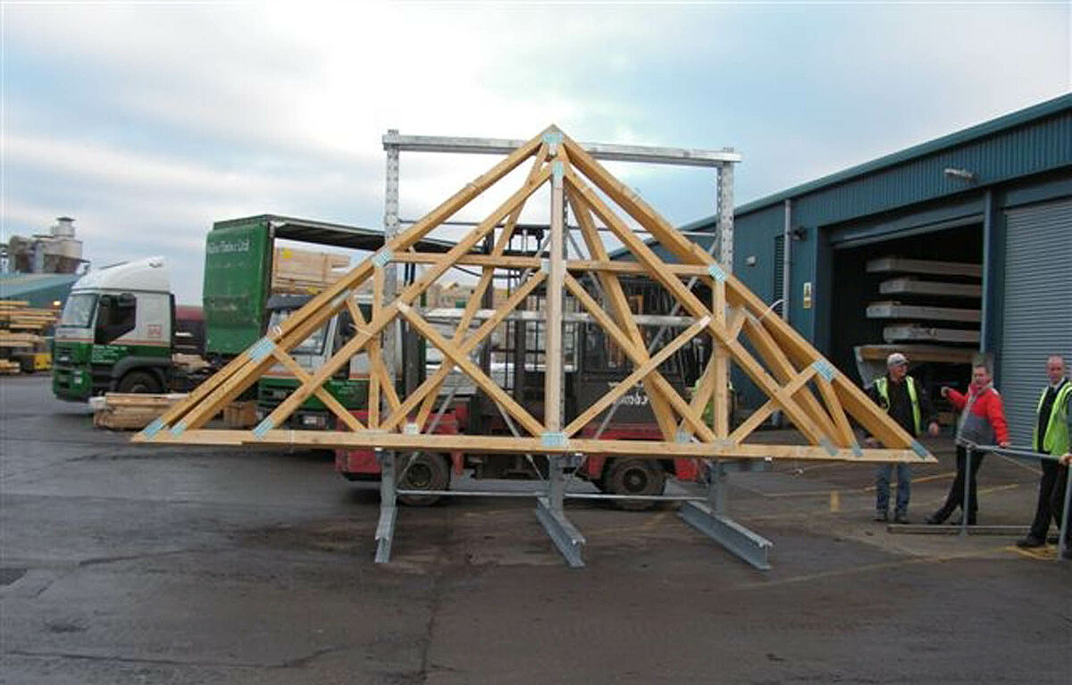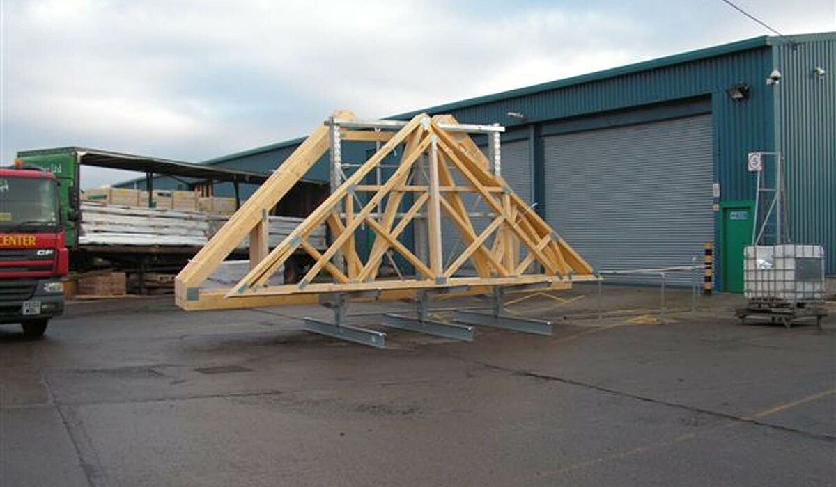 Walker Timber Ltd., especializada en la fabricación de cerchas de tejado y construcciones de madera, con asiento en Bo’ness, en las proximidades de Edimburgo (Escocia), necesitaba un sistema de almacenamiento para las construcciones de cerchas de tejado recientemente fabricadas. Éstas debían ser almacenadas en forma segura y conveniente para los apiladores en el terreno exterior hasta su carga en camiones.