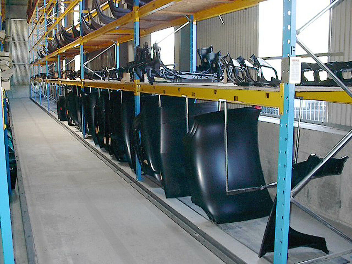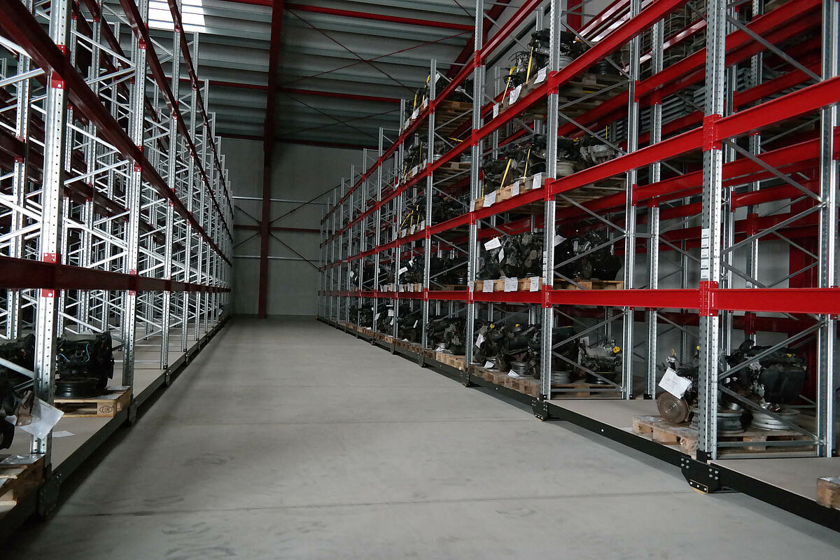 Las estanterías de paletización robustas son particularmente adecuadas para el almacenamiento, neumáticos y llantas, así como de piezas de repuesto, artículos pequeños o componentes voluminosos, tales como motores y transmisiones.
