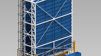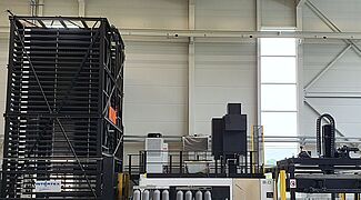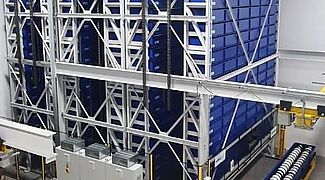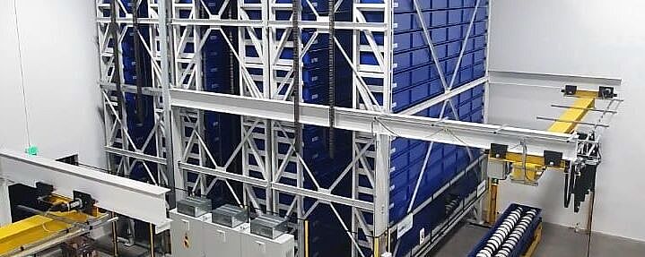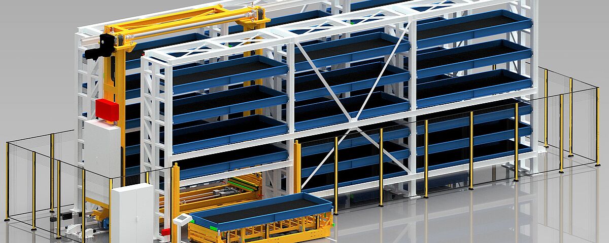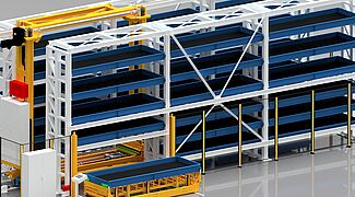 2. El TowerMat TM-FE está diseñado para capacidades de almacenamiento medias y, gracias a varias torres de almacenamiento y un transelevador central, permite una eficiencia especialmente alta.