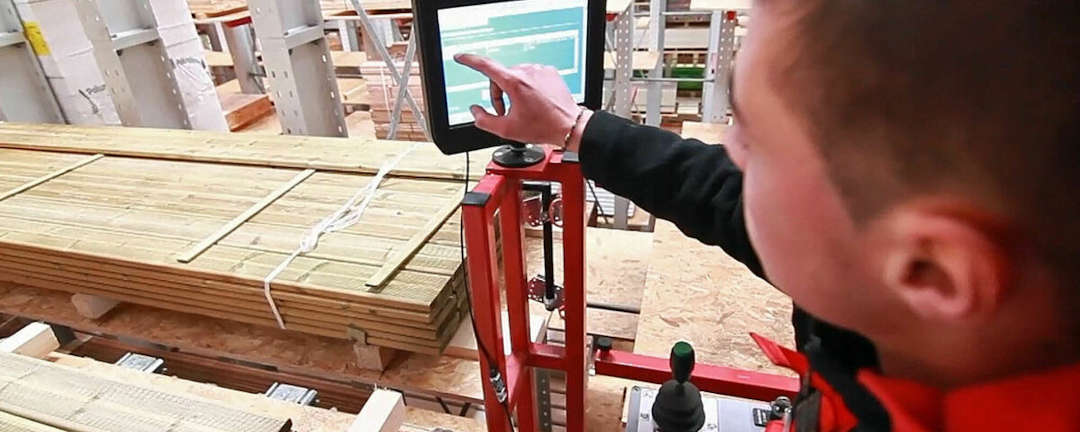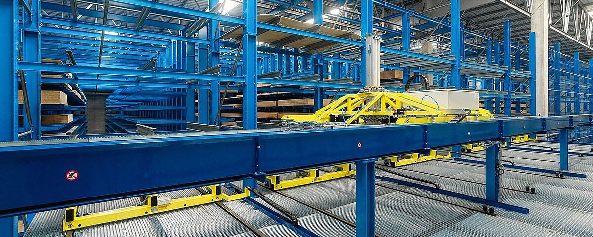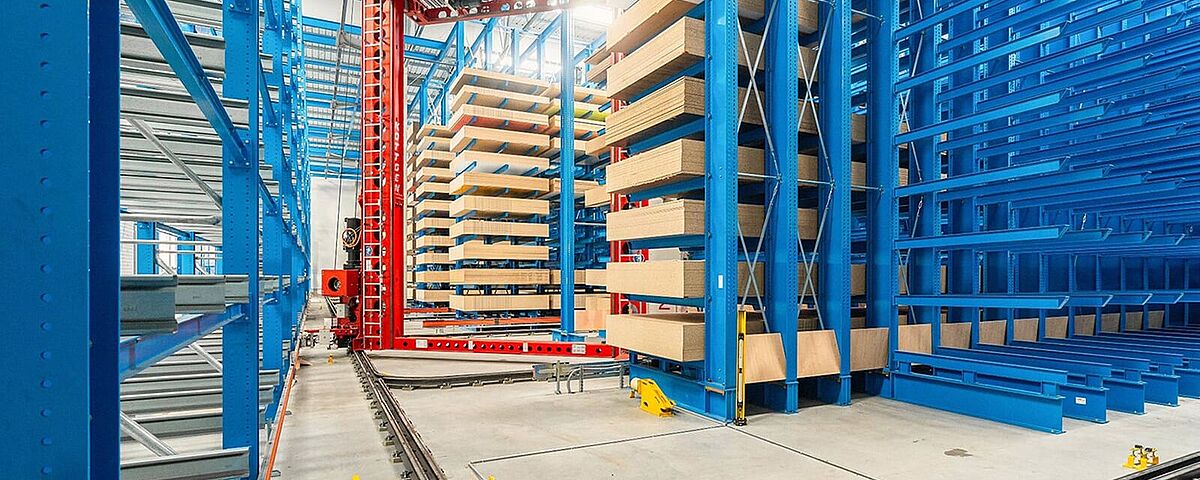 El transelevador se mueve automáticamente al lugar de almacenaje de la estantería previamente determinado por el operario. El posicionamiento exacto delante del lugar de almacenaje se realiza de forma completamente automática, mientras que los procesos de almacenamiento y recuperación de, p. ej., tableros de madera son controlados por el operario mediante una orden manual. Entre otros se incluyen la elevación y el descenso de las cargas, así como el sentido de marcha de las horquillas.
