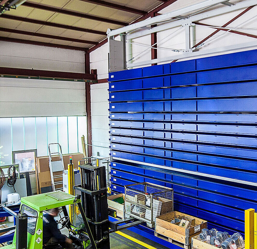 El sistema InterMat es una estantería rotativa automatizada que funciona según el principio paternoster. Las mercancías almacenadas se ponen a disposición del operador con solo pulsar un botón, de forma rápida, fiable y sin búsquedas manuales. Los ámbitos de aplicación incluyen, entre otros, el almacenamiento de mercancía larga, tambores de cable, cilindros o materiales en rollo.
